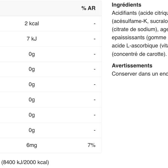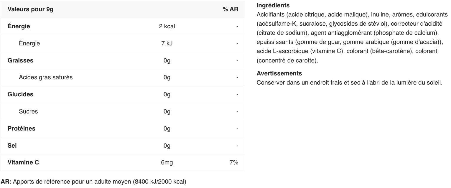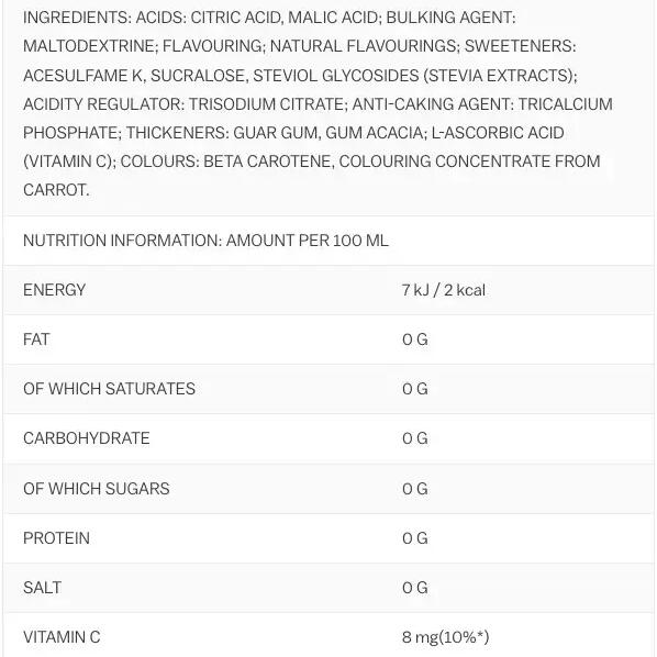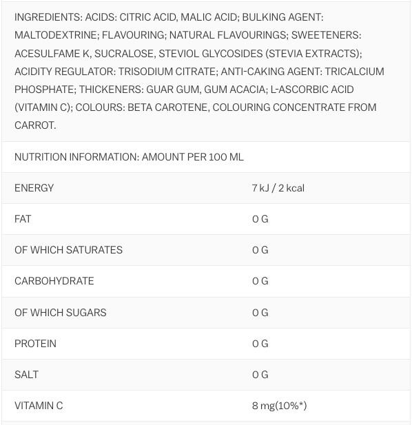 acids( citric acid, malic acid), maltodextrin, flavourings, sweeteners( acesulfame K, sucralose, steviol glycosides from stevia), acidity regulator( sodium citrate), anti-caking agent( calcium phosphates), thickener( guar gum, gum arabic), L-ascorbic acid( Vitamin C), colours( beta-carotene, carrot concentrate)