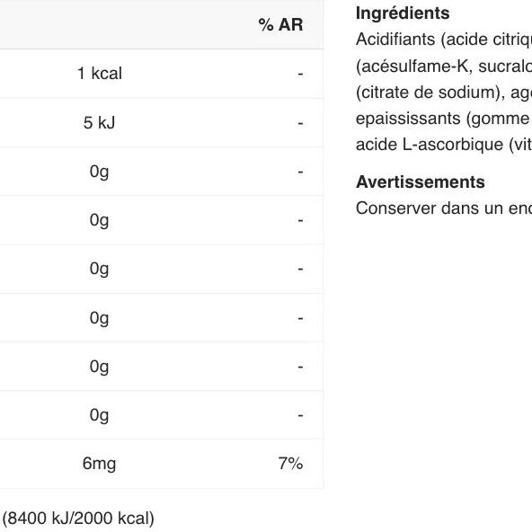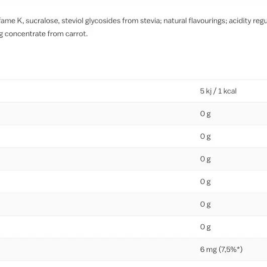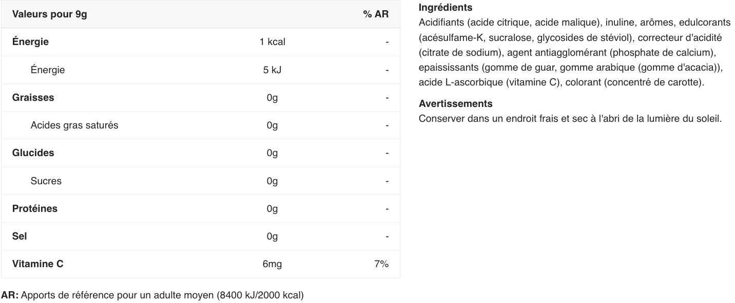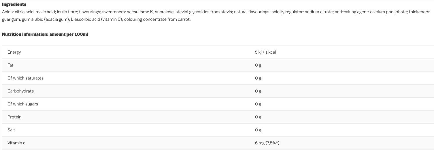 acids( citric acid, malic acid), maltodextrin, flavourings, sweeteners( acesulfame K, sucralose, steviol glycosides from stevia), acidity regulator( sodium citrate), anti-caking agent( calcium phosphates), thickener( guar gum, gum arabic), L-ascorbic acid( Vitamin C), colours( carrot concentrate)