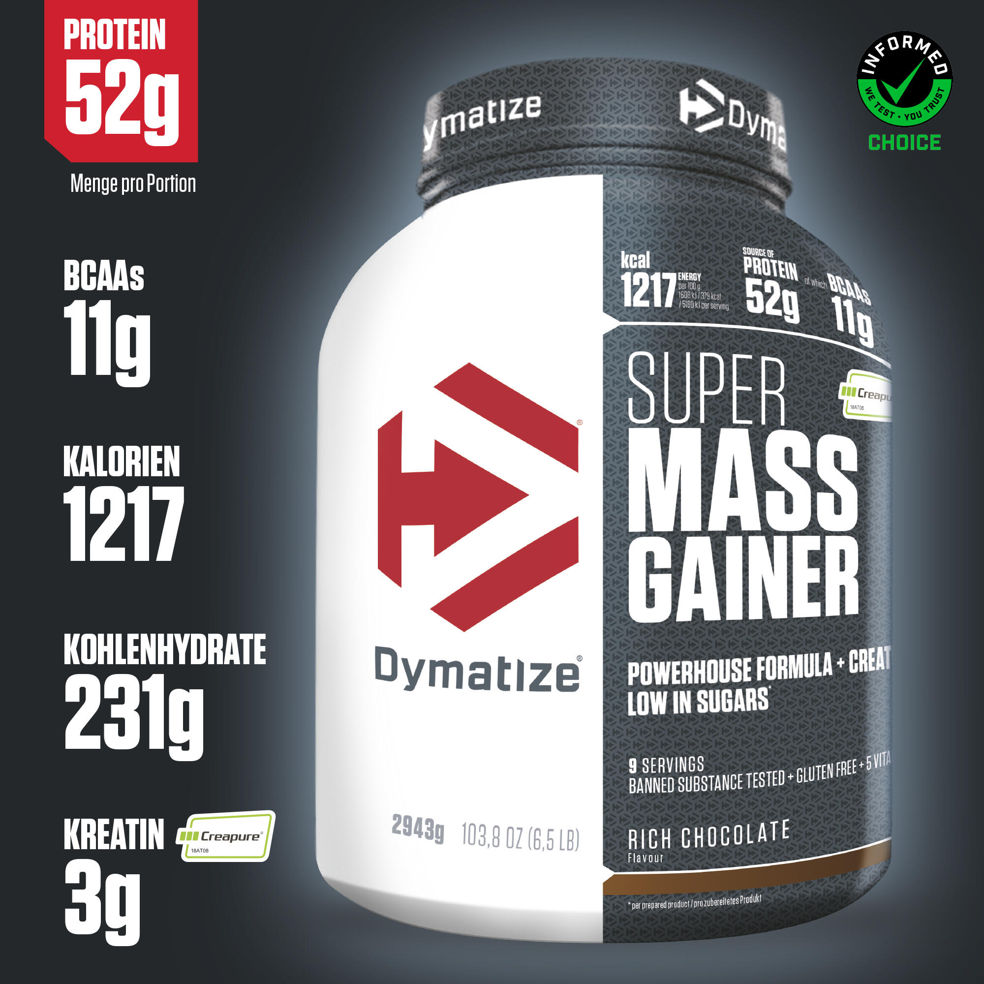 Super Mass Gainer from Dymatize is a quality drink containing carbohydrates, proteins, vitamins and creatine.