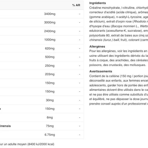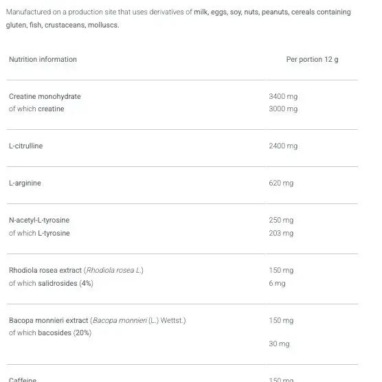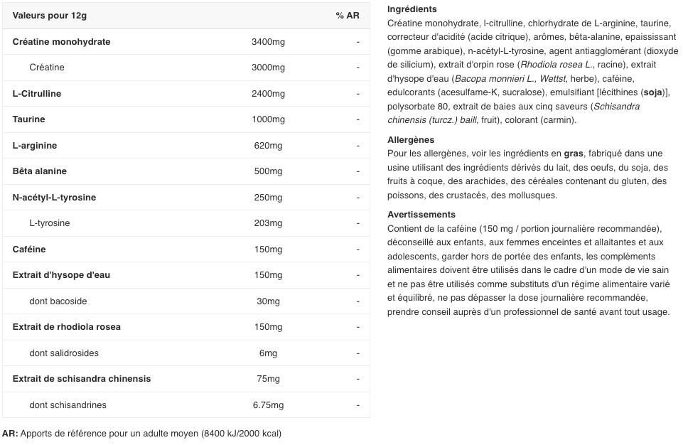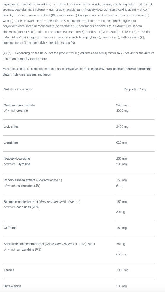 Ingredients - cola flavour: creatine monohydrate, l-citrulline, L-arginine hydrochloride, taurine, acidity regulator (citric acid), flavourings, beta-alanine, thickener (gum arabic), n-acetyl-L-tyrosine, anti-caking agent (silicon dioxide), rose hip extract (Rhodiola rosea L., root), water hyssop extract (Bacopa monnieri L., Wettst, herb), caffeine, sweeteners (acesulfame-K, sucralose), emulsifier [lécithines (soja)], polysorbate 80, five-flavored berry extract (Schisandra chinensis (turcz.) baill, fruit), colorant (ammonium sulfite caramel).Ingredients - cranberry flavour: creatine monohydrate, l-citrulline, L-arginine hydrochloride, taurine, acidity regulator (citric acid), flavourings, beta-alanine, thickener (gum arabic), n-acetyl-L-tyrosine, anti-caking agent (silicon dioxide), rose hip extract (Rhodiola rosea L., root), water hyssop extract (Bacopa monnieri L., Wettst, herb), caffeine, sweeteners (acesulfame-K, sucralose), emulsifier [lécithines (soja)], polysorbate 80, five-flavour berry extract (Schisandra chinensis (turcz.) baill, fruit), colouring (carmine).
