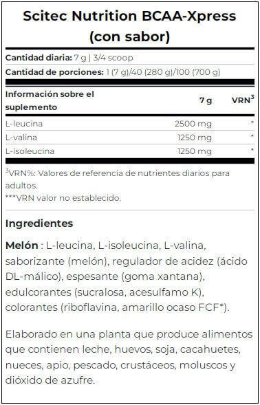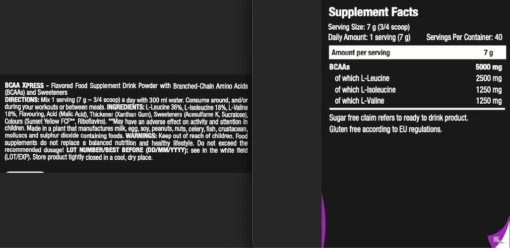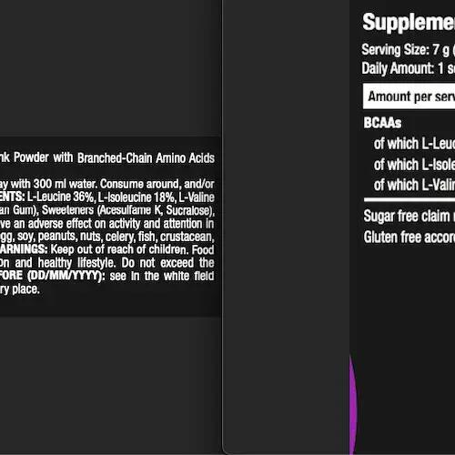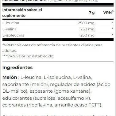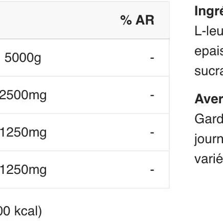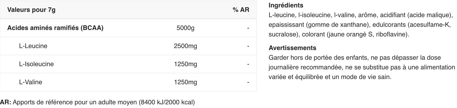 Ingredients Pear: L-leucine 36%, L-isoleucine 18%, L-valine 18%, flavouring, citric and malic acids, thickener (xanthan gum), sweeteners (sucralose, acesulfame K). Melon ingredients: L-leucine 36%, L-isoleucine 18%, L-valine 18%, flavouring, malic acid, thickener (xanthan gum), sweeteners (sucralose, acesulfame K), color (sunshine yellow FCF*, riboflavins). *May have adverse effects on activity and attention in children. Ingredients Apple : L-leucine 36%, L-isoleucine 18%, L-valine 18%, citric acid, flavour, sweeteners (sucralose, acesulfame K), color (sulfite ammonia caramel, riboflavins). Blood orange ingredients: L-leucine 36%, L-isoleucine 18%, L-valine 18%, malic acid, thickener (xanthan gum), flavouring, sweeteners (sucralose, acesulfame K), concentrated beet powder [maltodextrine, concentré de betterave, acide citrique, extrait de curcuma, épaississant (gomme arabique), extrait de rhizome de curcuma, antiaggrégant (dioxyde de silicone)], color (Azorubine*). *May have adverse effects on activity and attention in children. Ingredients Mango: L-leucine 36%, L-isoleucine 18%, L-valine 18%, flavour, malic acid, thickener (xanthan gum), sweeteners (sucralose, acesulfame K), color (FCF sunshine yellow*). *May have adverse effects on activity and attention in children. Coca lime ingredients: L-leucine 36%, L-isoleucine 18%, L-valine 18%, flavourings, malic acid, sweeteners (sucralose, acesulfame K), color (sulfite ammonia caramel).