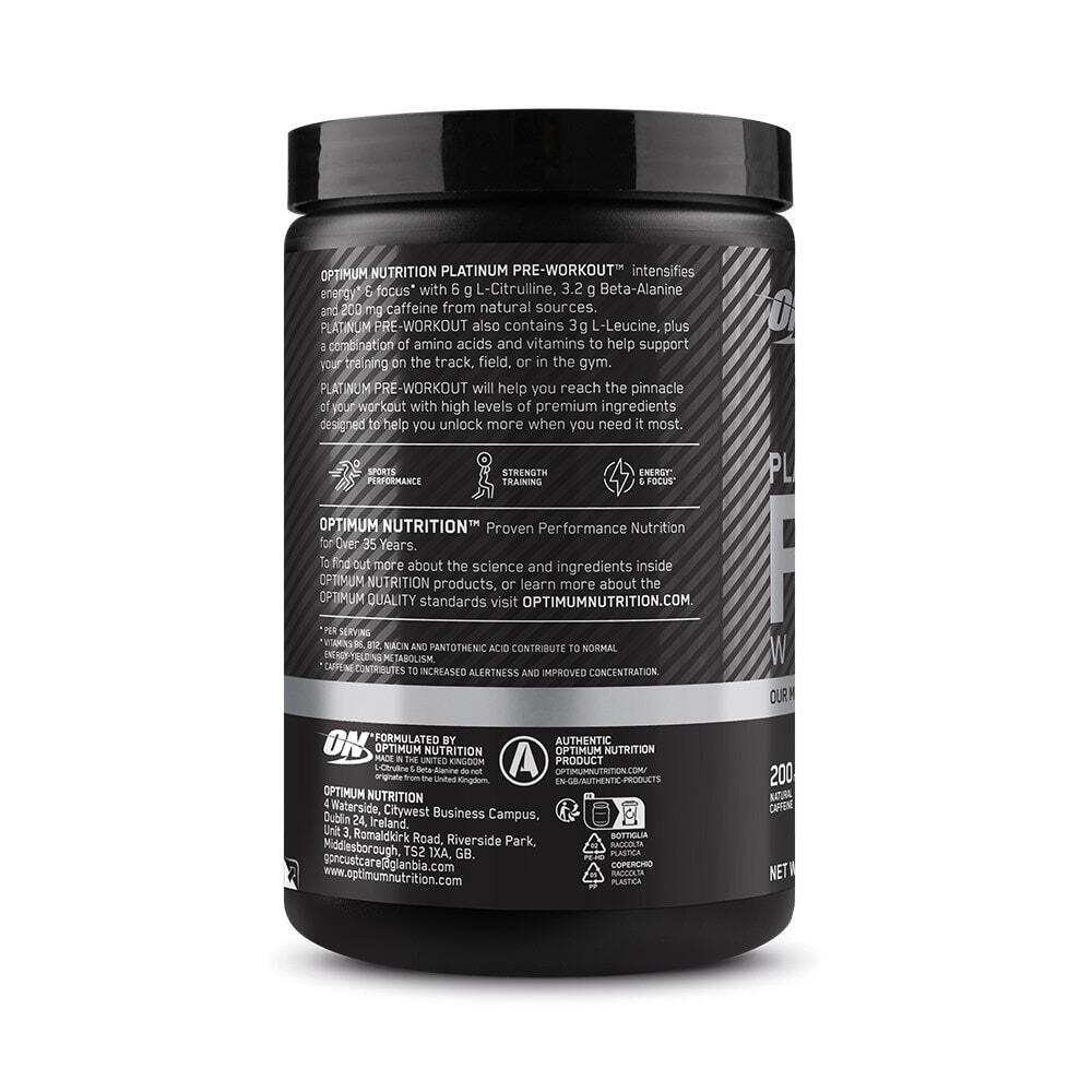 Platinum Pre Workout by Optimum Nutrition is a pre-workout supplement that maximizes your energy and focus with 6g of L-citrulline, 3.2g of beta-alanine, and 200mg of caffeine.