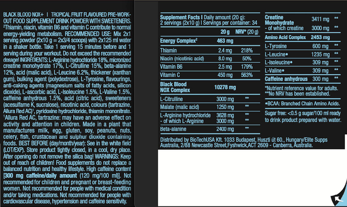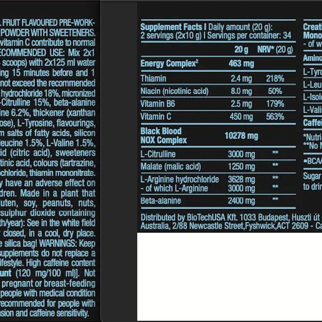 Black Blood NOX by BiotechUSA is a performance enhancer that contains BIG doses of everything needed for effective training