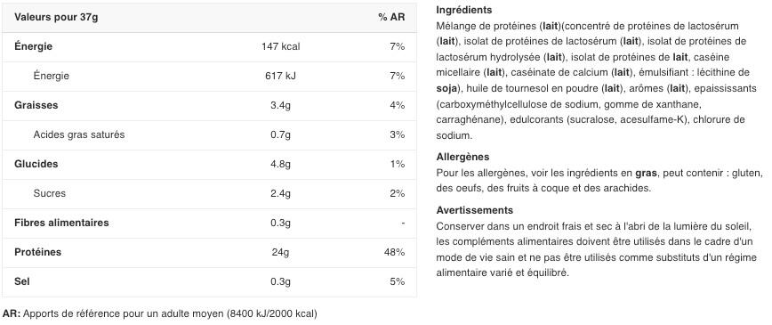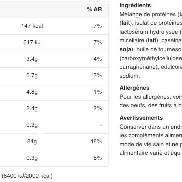 Nutritional information chocolate One portion: 39g Per portion %AR* Calories 149 kcal 8% Fat 3,6 g 5% of which saturated 0,8 g 4% Salt 0.5 g 9% Carbohydrates 3,5 g 1% of which sugars 1 g 1% Fibre 1,2 g - Protein 24 g 49% * Reference Intake for a typical adult - AR not determined Nutritional information vanilla One portion: 37 g Per portion %AR* Calories 147 kcal 7% Fat 3,4 g 5% of which saturated 0,7 g 3% Salt 0.3 g 5% Carbohydrates 4.8 g 2% of which sugars 2.4 g 3% Fibre 0.3 g - Protein 24 g 48% * Reference Intake for a typical adult - AR not determined Nutritional information cookie One dose : 38 g Per serving %AR* Calories 153 kcal 8% Fat 3.7 g 5% of which saturated 0.7 g 4% Salt 0.31 g 5% Carbohydrates 5.3 g 2% of which sugars 1.5 g 2% Fiber 0.5 g - Protein 24 g 49% * Reference Intake for a typical adult - RA not determined Nutritional information strawberry One serving: 37 g Per serving %AR* Calories 149 kcal 8% Fat 3.5 g 5% of which saturated 0.7 g 3% Salt 0.21 g 3% Carbohydra