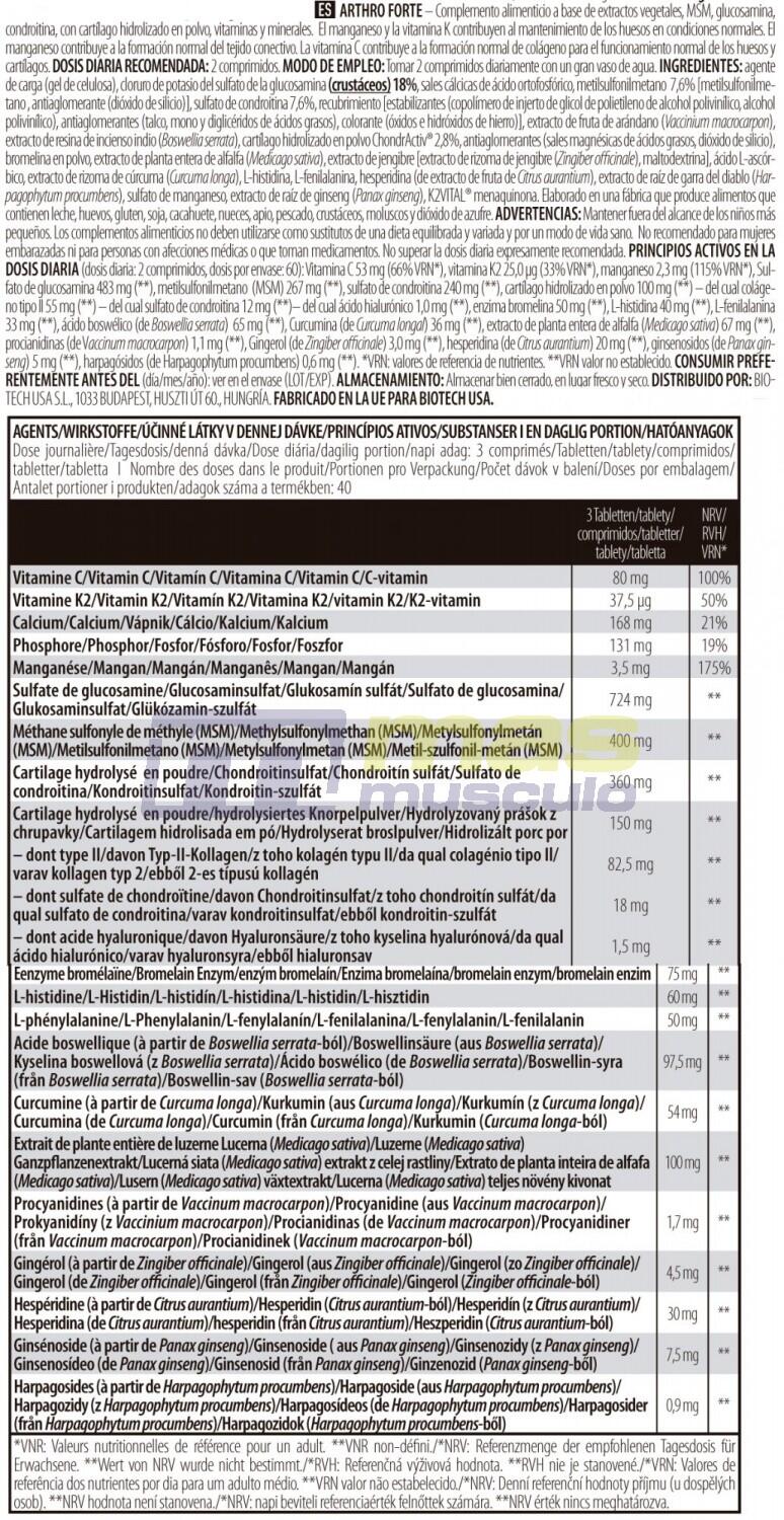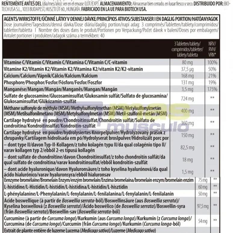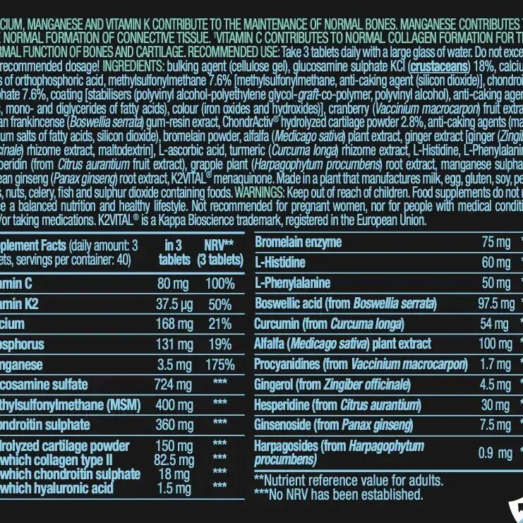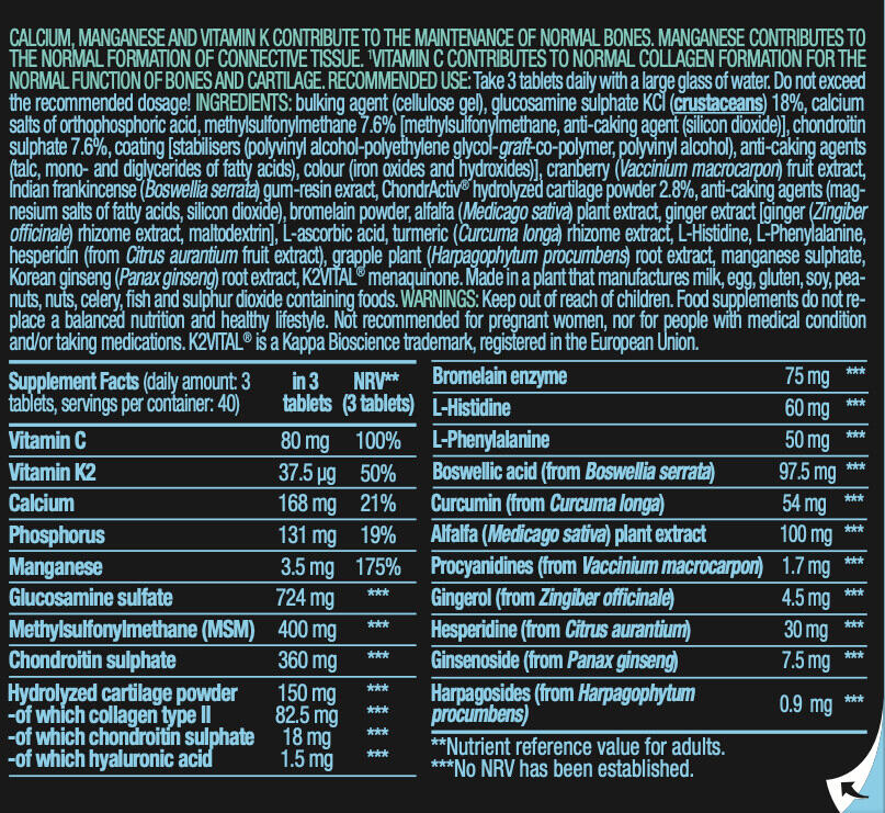 NUTRITIONAL INFORMATIONServing size: 3 tabletsPer 3 VNR* tabletsVitamin C 80 mg 100%Vitamin K2 37.5 µg 50%Calcium 168 mg 21Phosphorus 131 mg 19Manganese 3.5 mg 175Glucosamine sulfate 724 mg -Methyl methanesulfonyl (MSM) 400 mg -Chondroitin sulfate 360 mg -Hydrolyzed cartilage powder- of which type II- of which chondroitin sulfate- of which hyaluronic acid150 mg82.5 mg18 mg1.5 mg----Eenzyme bromelain75 mg-L-histidine 60 mg -L-phenylalanine 50 mg -Boswellic acid (from Boswellia serrata-ból)97.5 mg - CurcuminCurcumin (from Curcuma longa)54 mg - CurcuminLucerne whole plant extract (Medicago sativa)100 mg - ProcyanidinsProcyanidins (from Vaccinum macrocarpon)1.7 mg - Gingerol (from Zingiber officinale)Gingerol (from Zingiber officinale)4.5 mg - HesperidinHesperidin (from Citrus aurantium) 30 mgGinsenoside 7.5 mg -Harpagosides 0.9 mg -*NRV: nutritional reference values for an adult.