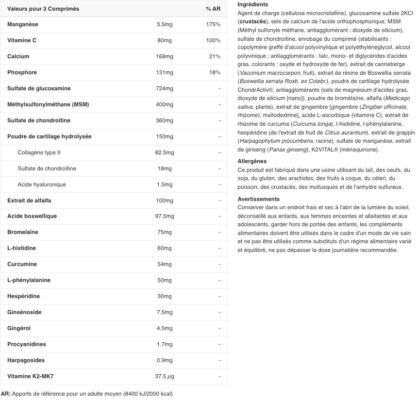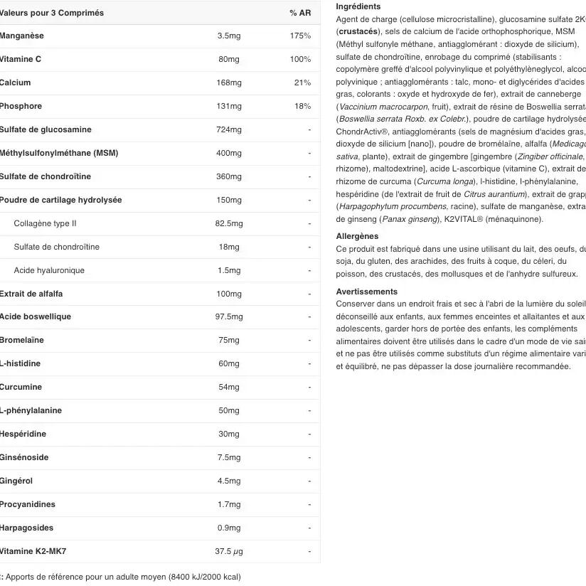 Ingredients: Bulking agent (cellulose gel), glucosamine potassium chloride sulfate(crustaceans), calcium salts of orthophosphoric acid,methylsulfonylmethane, chondroitin sulfate, coating {stabilisants [copolymère greffé d?alcool polyvinylique et de polyéthylèneglycol], antiagglomérants (talc, mono- et diglycérides d?acides gras)}, collagen, Indian frankincense resin extract (Boswellia serrata), cranberry leaf extract (Vaccinium macrocarpon), anti-caking agents (magnesium salts of fatty acids, silicon dioxide), alfalfa extract (Medicago sativa), ginger root extract (Zingiber officinale), bromelain enzyme [d?ananas (Ananas comosus), 1000 GDU], Asian ginseng root extract (Panax ginseng), bitter orange fruit extract (Citrus aurantium), turmeric root extract (Curcuma longa), L-histidine, L-phenylalanine, harpagophytum root extract (Harpagophytum procumbens), manganese sulfate.
