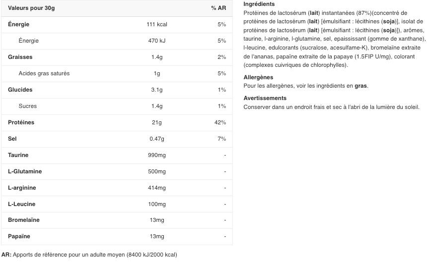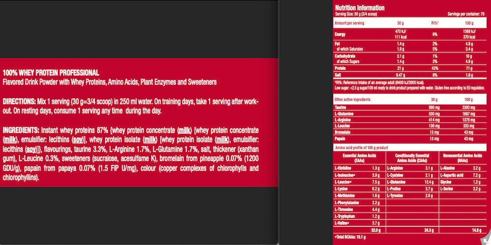 100% Whey Protein Professional - 2350g by Scitec Da 100% Whey Protein Professional is an excellent quality whey protein blend from whey concentrate and whey protein isolate. Isolated + Concentrated Whey Protein Dietary proteins are a source of nitrogen and essential amino acids that the body needs for tissue growth and maintenance. So 100% Whey Protein Professional helps to increase and conserve muscle mass and also to keep bones in normal condition. Whey protein is what is called a complete protein because provides the body with all the necessary amino acids, including the 9 amino acids that the body cannot synthesize and which must be supplied by the diet (ie histidine, isoleucine, leucine, lysine, methionine, phenylalanine, threonine, tryptophan and valine). High Quality Protein 100% Whey Protein Professional has more components added: an amino acid matrix that provides additional amino acids such as L-leucine, L-glutamine and taurine. Our formula also includes a blend of two digestive enzymes: papain and bromelain.