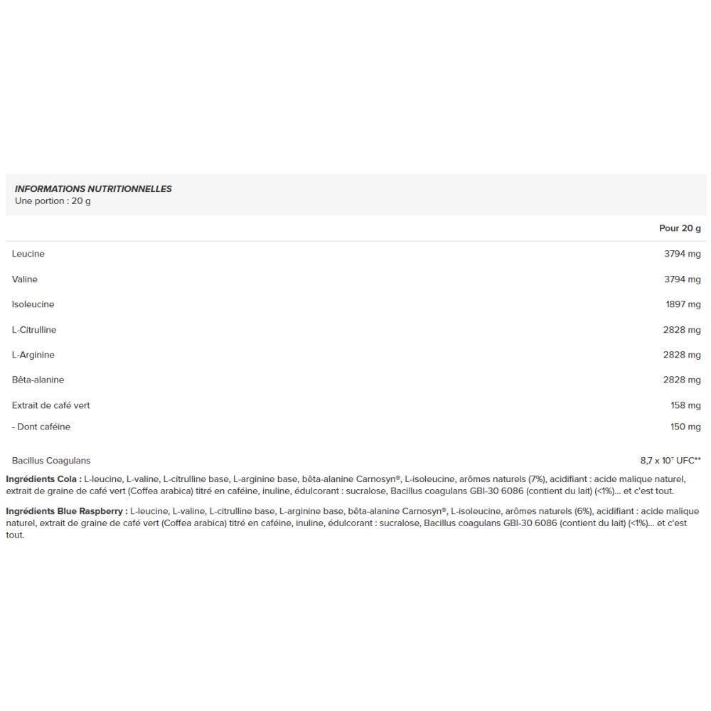 Pre-Workout from Nutrimuscle is a formula designed to give you optimum support before exercise. Its aim: to help you tackle each session with greater energy, concentration and stamina.Each portion provides you with :150 mg of caffeine, to stimulate your nervous system and help you stay focused without excessive side effects,A complex ofessential amino acids (BCAA), leucine, valine, isoleucine, to nourish your muscles from the very first repetitions,Citrulline, beta-alanine and arginine, key precursors of nitric oxide, promoting muscle congestion and endurance.But what really sets this pre-workout apart is the addition of Bacillus coagulans, a probiotic strain that supports your digestive comfort and nutrient assimilation, for maximum efficiency without gastric discomfort.With no artificial sweeteners, no controversial substances, and made with high-quality raw materials, Pre-Workout de Nutrimuscle pre-Workout fits perfectly into a serious, high-performance training routine.Available in two flavours: Cola and Blue Raspberry.