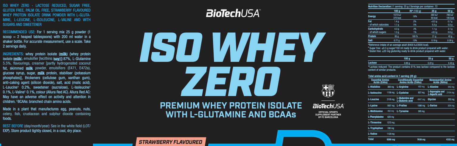 Discover Iso Whey Zero from the famous BioTech USA brand!Iso Whey Zero (1,816 g) with sweetener is made from 'Native Whey Isolat', a protein derived from fresh pasteurized milk, micro and ultra-filtered at low temperature and dried by a special process, to obtain the most complete protein possible. The protein isolate obtained is rich in immunoglobin (also known as antibodies) and lactoferrin. This protein is easily digested and rapidly assimilated by the body, making it a perfect supplemental or post-workout snack.This BioTech protein isolate has an exceptional protein content of 21 g per 25 g dose and a BCAA concentration of 4.5 g. Protein and BCAAs help build muscle and repair fibers damaged during training.This protein powder formula is an excellent source for sportsmen and women who want to provide extra nutrients for a lean, muscular body, or for figure-conscious people who want to supplement their protein intake while limiting calorie intake, as one portion provides just 93 kcal.One of the special features of this isolate is that, thanks to micro-filtration, it is lactose-reduced, making it suitable for people with lactose intolerance who still wish to consume milk protein.Available in the following flavors: Vanilla, Strawberry, Banana, Chocolate, Pineapple Mango, Cookies & Cream, Pistachio, Hazelnut, Café Latte, Tiramisu, Black Biscuit, Salted Caramel and Lemon Cheesecake