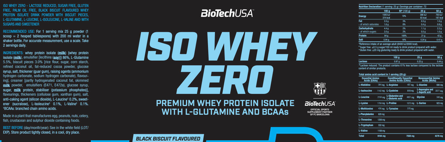 Discover Iso Whey Zero from the famous BioTech USA brand!Iso Whey Zero (1,816 g) with sweetener is made from 'Native Whey Isolat', a protein derived from fresh pasteurized milk, micro and ultra-filtered at low temperature and dried by a special process, to obtain the most complete protein possible. The protein isolate obtained is rich in immunoglobin (also known as antibodies) and lactoferrin. This protein is easily digested and rapidly assimilated by the body, making it a perfect supplemental or post-workout snack.This BioTech protein isolate has an exceptional protein content of 21 g per 25 g dose and a BCAA concentration of 4.5 g. Protein and BCAAs help build muscle and repair fibers damaged during training.This protein powder formula is an excellent source for sportsmen and women who want to provide extra nutrients for a lean, muscular body, or for figure-conscious people who want to supplement their protein intake while limiting calorie intake, as one portion provides just 93 kcal.One of the special features of this isolate is that, thanks to micro-filtration, it is lactose-reduced, making it suitable for people with lactose intolerance who still wish to consume milk protein.Available in the following flavors: Vanilla, Strawberry, Banana, Chocolate, Pineapple Mango, Cookies & Cream, Pistachio, Hazelnut, Café Latte, Tiramisu, Black Biscuit, Salted Caramel and Lemon Cheesecake