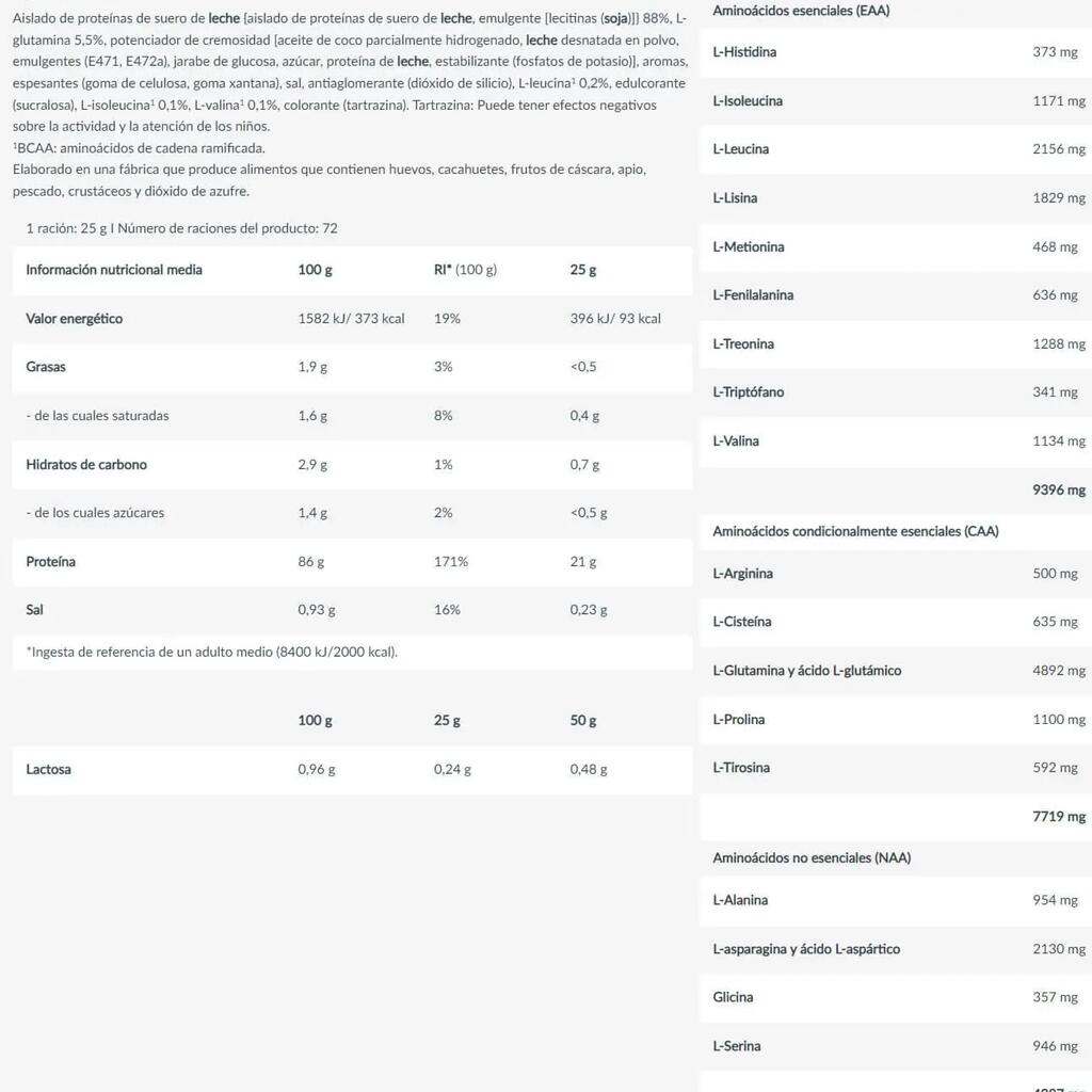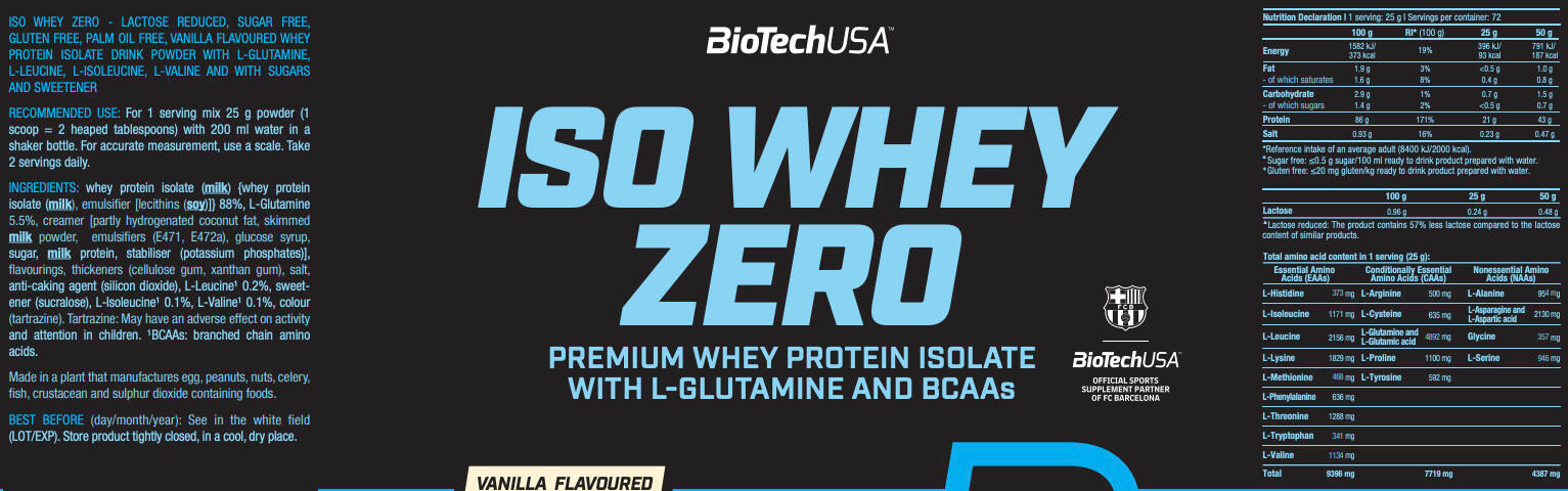 Discover Iso Whey Zero from the famous BioTech USA brand!Iso Whey Zero (1,816 g) with sweetener is made from 'Native Whey Isolat', a protein derived from fresh pasteurized milk, micro and ultra-filtered at low temperature and dried by a special process, to obtain the most complete protein possible. The protein isolate obtained is rich in immunoglobin (also known as antibodies) and lactoferrin. This protein is easily digested and rapidly assimilated by the body, making it a perfect supplemental or post-workout snack.This BioTech protein isolate has an exceptional protein content of 21 g per 25 g dose and a BCAA concentration of 4.5 g. Protein and BCAAs help build muscle and repair fibers damaged during training.This protein powder formula is an excellent source for sportsmen and women who want to provide extra nutrients for a lean, muscular body, or for figure-conscious people who want to supplement their protein intake while limiting calorie intake, as one portion provides just 93 kcal.One of the special features of this isolate is that, thanks to micro-filtration, it is lactose-reduced, making it suitable for people with lactose intolerance who still wish to consume milk protein.Available in the following flavors: Vanilla, Strawberry, Banana, Chocolate, Pineapple Mango, Cookies & Cream, Pistachio, Hazelnut, Café Latte, Tiramisu, Black Biscuit, Salted Caramel and Lemon Cheesecake
