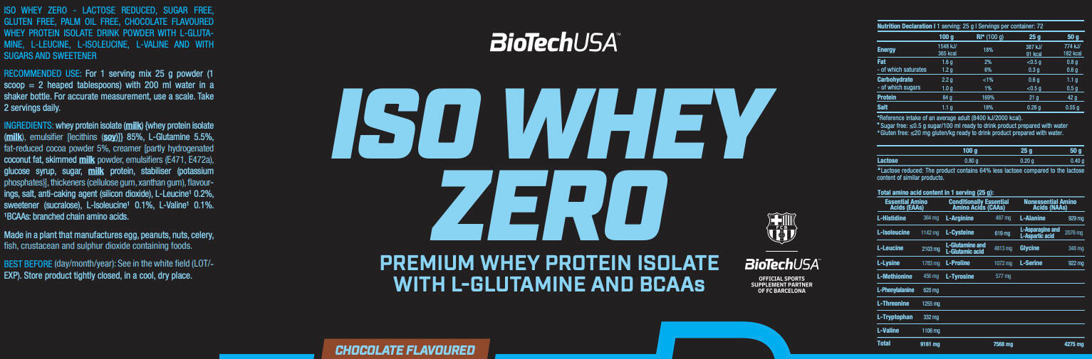 Discover Iso Whey Zero from the famous BioTech USA brand!Iso Whey Zero (1,816 g) with sweetener is made from 'Native Whey Isolat', a protein derived from fresh pasteurized milk, micro and ultra-filtered at low temperature and dried by a special process, to obtain the most complete protein possible. The protein isolate obtained is rich in immunoglobin (also known as antibodies) and lactoferrin. This protein is easily digested and rapidly assimilated by the body, making it a perfect supplemental or post-workout snack.This BioTech protein isolate has an exceptional protein content of 21 g per 25 g dose and a BCAA concentration of 4.5 g. Protein and BCAAs help build muscle and repair fibers damaged during training.This protein powder formula is an excellent source for sportsmen and women who want to provide extra nutrients for a lean, muscular body, or for figure-conscious people who want to supplement their protein intake while limiting calorie intake, as one portion provides just 93 kcal.One of the special features of this isolate is that, thanks to micro-filtration, it is lactose-reduced, making it suitable for people with lactose intolerance who still wish to consume milk protein.Available in the following flavors: Vanilla, Strawberry, Banana, Chocolate, Pineapple Mango, Cookies & Cream, Pistachio, Hazelnut, Café Latte, Tiramisu, Black Biscuit, Salted Caramel and Lemon Cheesecake