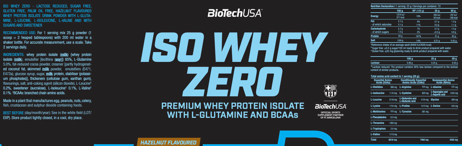 Discover Iso Whey Zero from the famous BioTech USA brand!Iso Whey Zero (1,816 g) with sweetener is made from 'Native Whey Isolat', a protein derived from fresh pasteurized milk, micro and ultra-filtered at low temperature and dried by a special process, to obtain the most complete protein possible. The protein isolate obtained is rich in immunoglobin (also known as antibodies) and lactoferrin. This protein is easily digested and rapidly assimilated by the body, making it a perfect supplemental or post-workout snack.This BioTech protein isolate has an exceptional protein content of 21 g per 25 g dose and a BCAA concentration of 4.5 g. Protein and BCAAs help build muscle and repair fibers damaged during training.This protein powder formula is an excellent source for sportsmen and women who want to provide extra nutrients for a lean, muscular body, or for figure-conscious people who want to supplement their protein intake while limiting calorie intake, as one portion provides just 93 kcal.One of the special features of this isolate is that, thanks to micro-filtration, it is lactose-reduced, making it suitable for people with lactose intolerance who still wish to consume milk protein.Available in the following flavors: Vanilla, Strawberry, Banana, Chocolate, Pineapple Mango, Cookies & Cream, Pistachio, Hazelnut, Café Latte, Tiramisu, Black Biscuit, Salted Caramel and Lemon Cheesecake