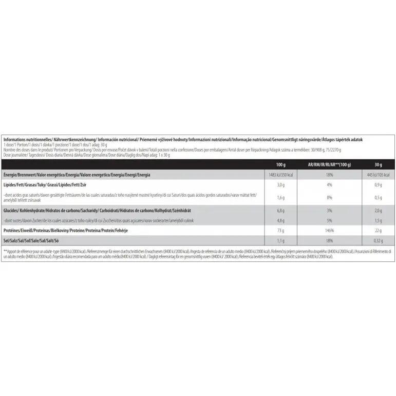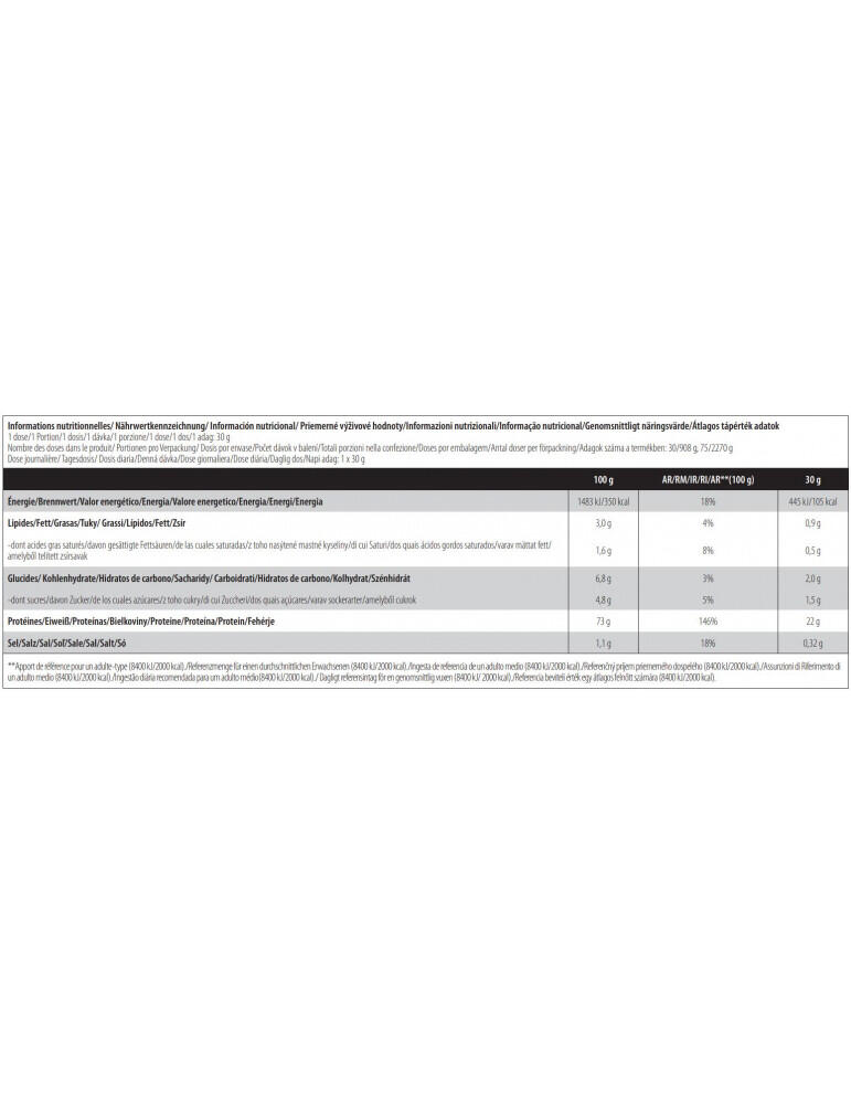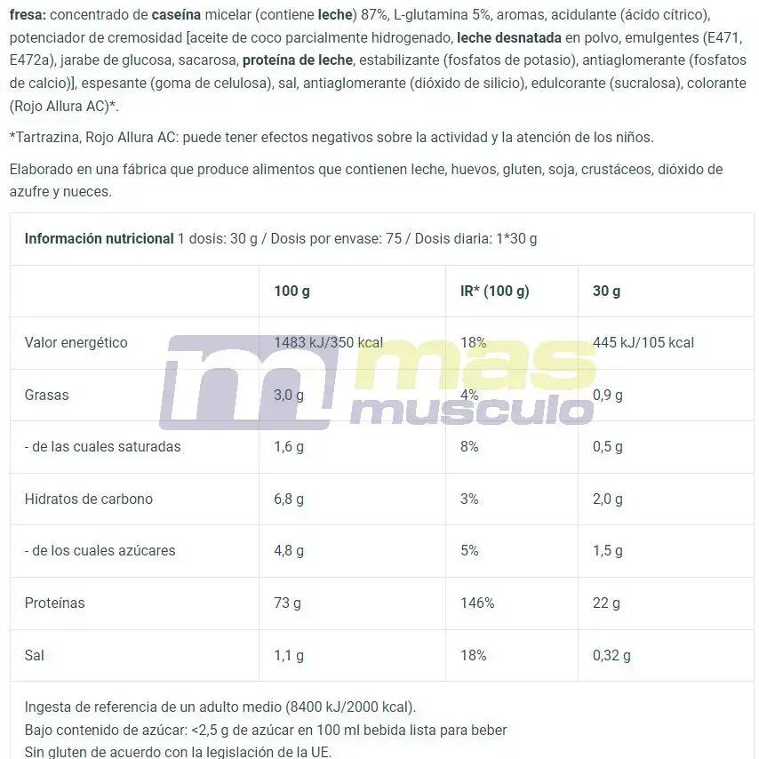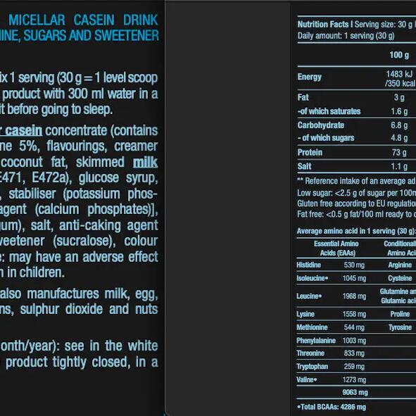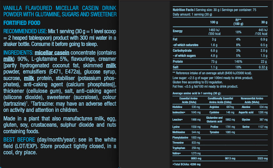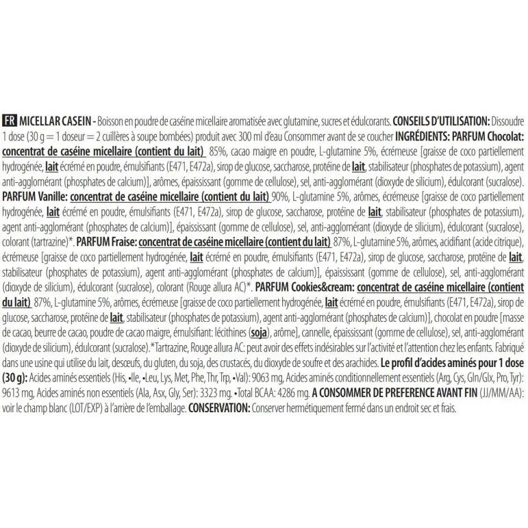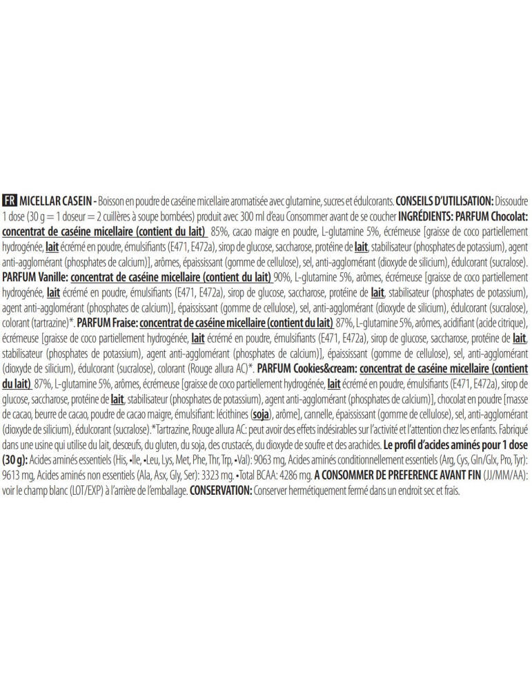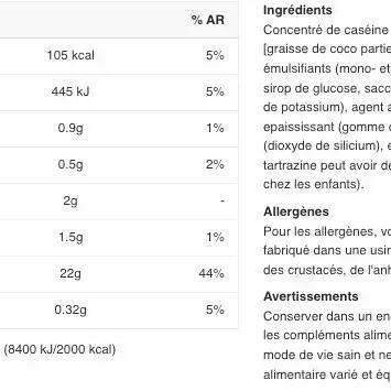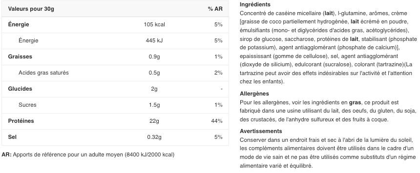 Vanilla-flavoured ingredients: calcium caseinate (contains milk) 90%, L-glutamine 5%, flavourings, skimming agent [graisse de coco partiellement hydrogénée, lait écrémé en poudre, émulsifiants (E471, E472a), sirop de glucose, saccharose, protéine de lait, stabilisateur (phosphates de potassium), agent anti-agglomérant (phosphates de calcium)], thickener (cellulose gum), salt, anti-caking agent (silicon dioxide), sweetener (sucralose), color (tartrazine)***. Chocolate-flavored ingredients: calcium caseinate (contains milk) 85%, low-fat cocoa powder, L-glutamine 5%, skimming agent [graisse de coco partiellement hydrogénée, lait écrémé en poudre, émulsifiants (E471, E472a), sirop de glucose, saccharose, protéine de lait, stabilisateur (phosphates de potassium), agent anti-agglomérant (phosphates de calcium)], flavoring, thickener (cellulose gum), salt, anti-caking agent (silicon dioxide), sweetener (sucralose). Strawberry-flavored ingredients: calcium caseinate 87%, L-glutamine 5%, flavoring, acidifier (citric acid), skimmer [graisse de coco partiellement hydrogénée, lait écrémé en poudre, émulsifiants (E471, E472a), sirop de glucose, saccharose, protéine de lait, stabilisateur (phosphates de potassium), agent anti-agglomérant (phosphates de calcium)], thickener (cellulose gum), salt, anti-caking agent (silicon dioxide), sweetener (sucralose), color (Allura Red AC)***.