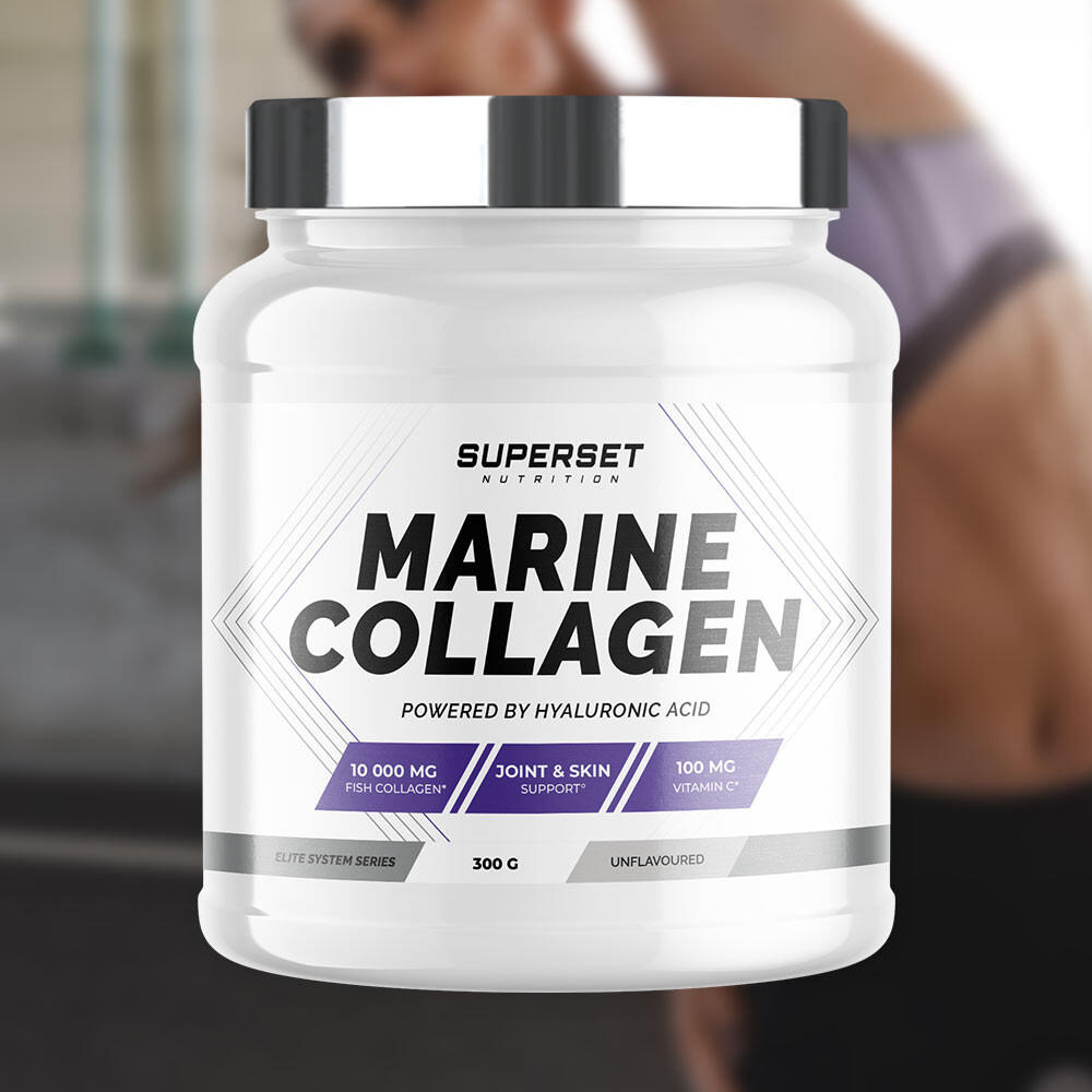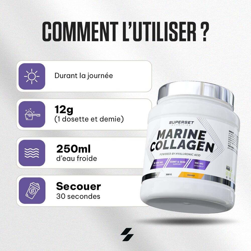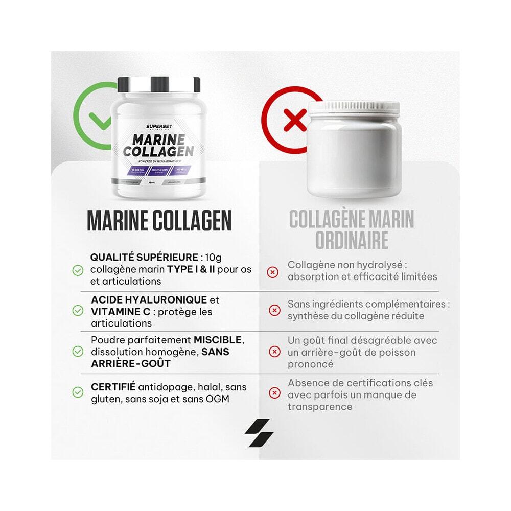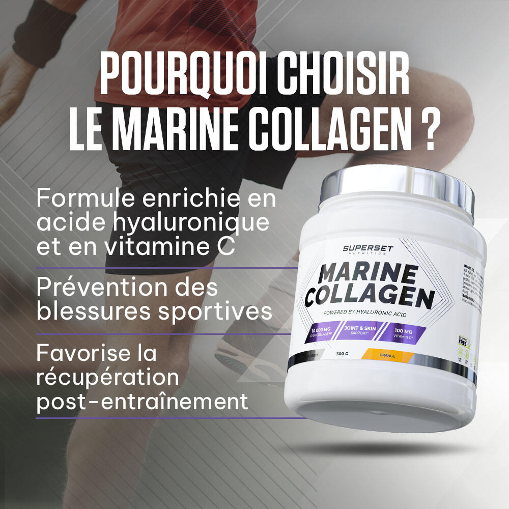 Give your body the support it deserves with MARINE COLLAGEN (300G)!MARINE COLLAGEN (300G) from Superset Nutrition is the essential dietary supplement for athletes and non-athletes alike! It's made from marine collagen, a protein ly present in the body that's so important for the health of your joints, bones, cartilage and tendons.MARINE COLLAGEN (300G) contributes to :Optimum joint comfortPrevent pain and injuryDid you know?Collagen degrades with age (from the age of 25!) - it's physiological... And this can lead to tissue degradation (joints, bones, muscles and skin). So, collagen supplementation is designed to support joint health as a preventive measure, especially when your joints are put to the test by regular physical activity!'>,The ultimate ally for strong, healthy joints!Its powerful formula, enriched with hyaluronic acid and vitamin C, offers multiple benefits!Vitamin C (100 mg per dose): has antioxidant properties that protect cells against oxidative stress and a key role in collagen synthesis, essential for healthy skin, joints and muscles.Hyaluronic acid (100 mg per dose): protects cartilage during intense physical effort and maintains joint suppleness and mobility, reducing the risk of injury and premature wear.As a bonus, you can be strong and beautiful, since collagen helps improve skin firmness and, coupled with hyaluronic acid, helps rehydrate the skin deep down, reduce wrinkles and improve skin elasticity and tone. Top quality!Thanks to its ultra-clean, complete formulation, MARINE COLLAGEN (300G) provides essential support all year round, helping to maintain healthy joints, promote recovery after exercise andoptimize your sports and healthresults!The advantages of MARINE COLLAGEN (300G)? Optimum assimilation (low molecular weight: 2000 daltons)Ofmarine originPerfectly miscible powder with no unpleasant aftertasteCertified anti-doping, gluten-free, soy-free, GMO-free and Halal