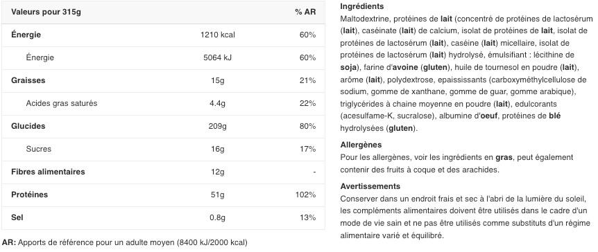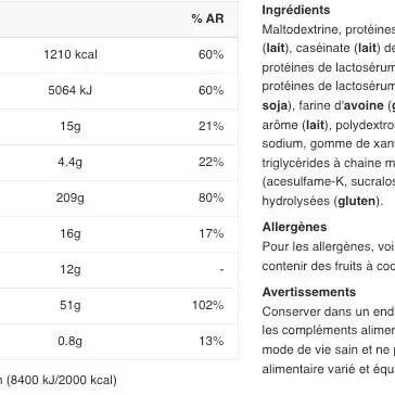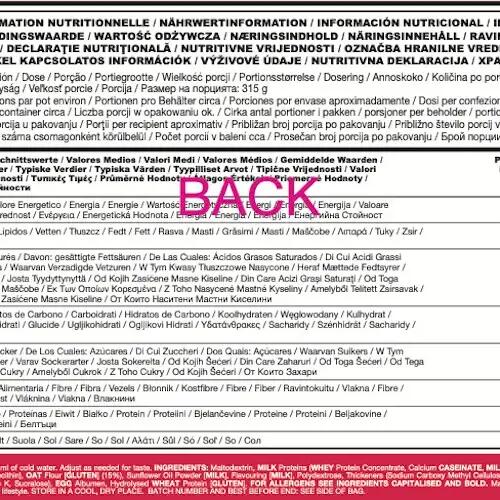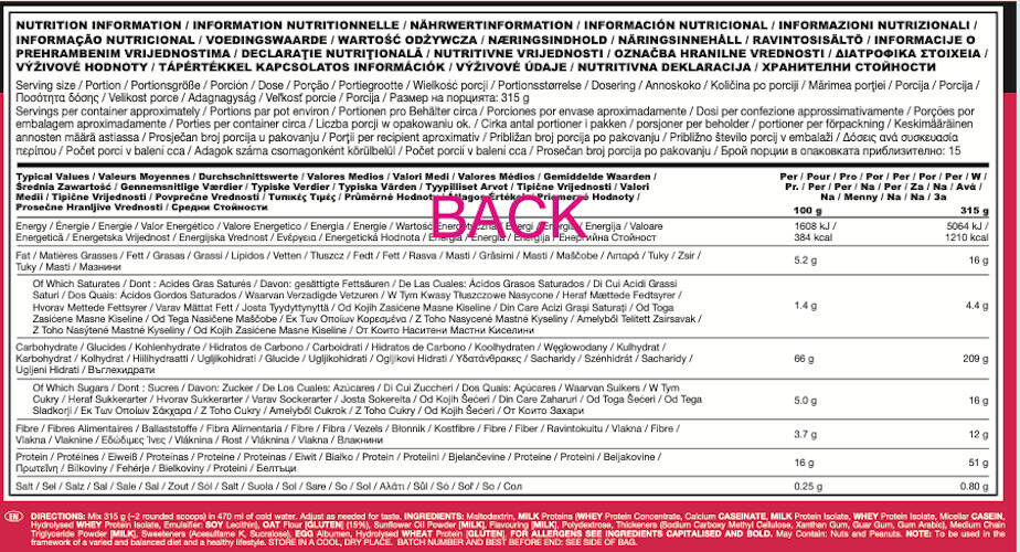 Maltodextrin, MILK Proteins (WHEY Protein Concentrate, Calcium CASEINATE, MILK Protein Isolate, WHEY Protein Isolate, Micellar CASEIN, Hydrolysed WHEY Protein Isolate, Emulsifier: SOY Lecithin), OAT Flour [GLUTEN] (15%), Sunflower Oil Powder [MILK], Flavouring [MILK], Polydextrose, Thickeners (Sodium Carboxy Methyl Cellulose, Xanthan Gum, Guar Gum, Gum Arabic), Medium Chain Triglyceride Powder [MILK], Sweeteners (Acesulfame K, Sucralose), EGG Albumen, Hydrolysed WHEAT Protein [GLUTEN]