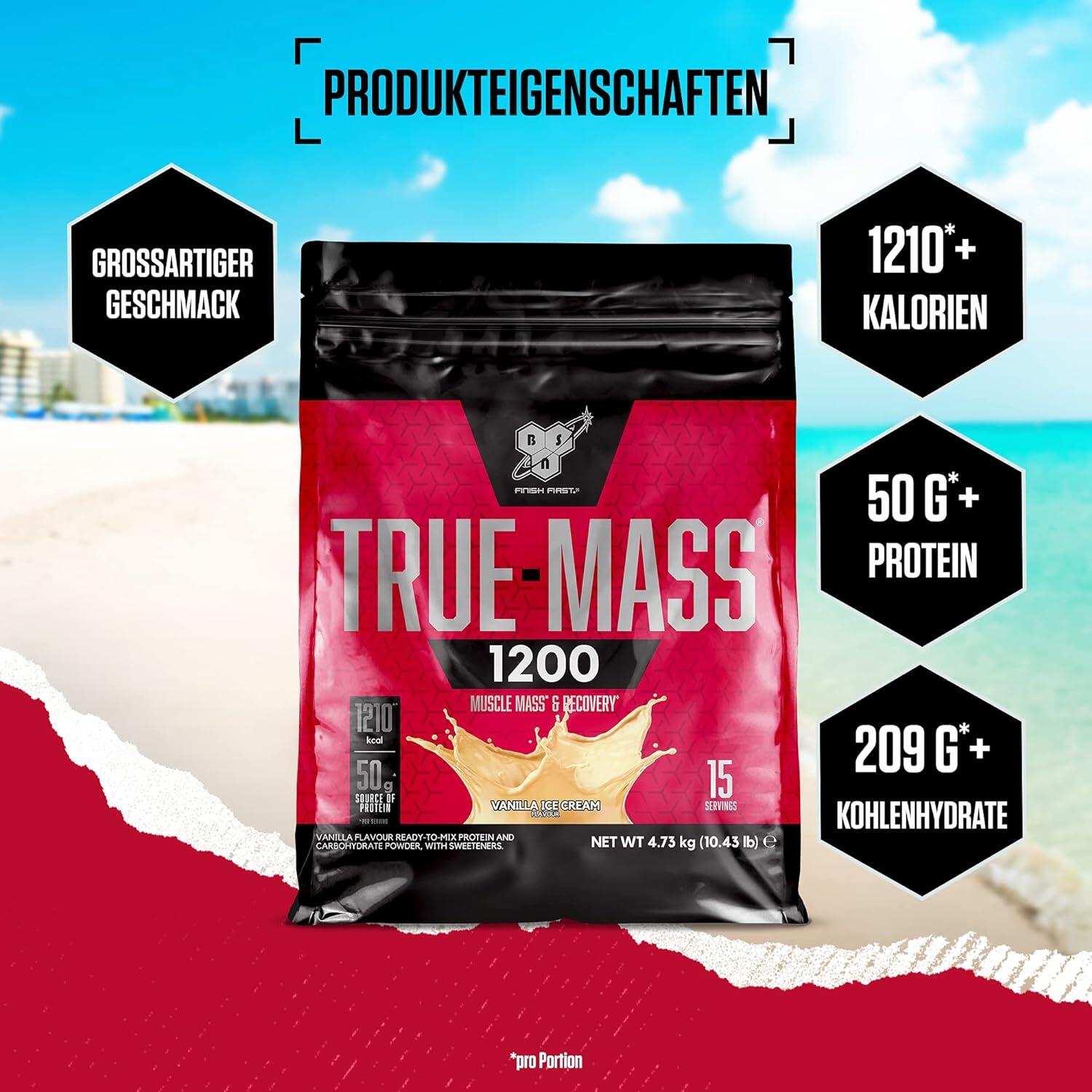 True Mass 1200 by BSN is designed to support muscle gains. Thanks to its innovative formula, it improves recovery and the regeneration of muscle tissue after intense training sessions. Rich in branched-chain amino acids (BCAAs), essential and semi-essential amino acids, True Mass 1200 helps slow muscle catabolism to enhance your gains in muscle size. In addition, thanks to BSN's exclusive technology, True Mass 1200 offers a perfect taste and smooth texture, making it as enjoyable to drink as a real milkshake. **Instructions for use:** Mix 2 rounded scoops (320 g) in 470 ml of cold water. Adjust as needed for taste.