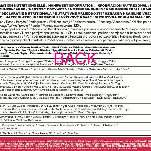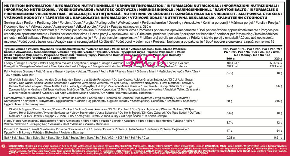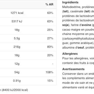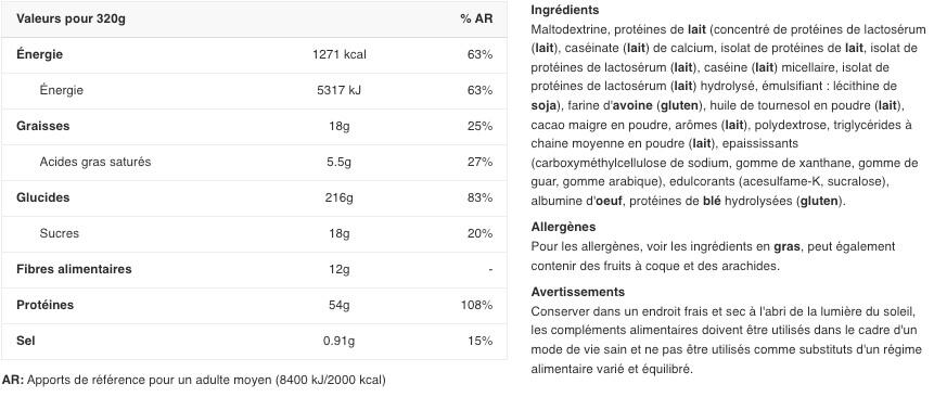 Supplementary food intended to provide an increased intake of protein and calories with the aim of optimizing muscle development.