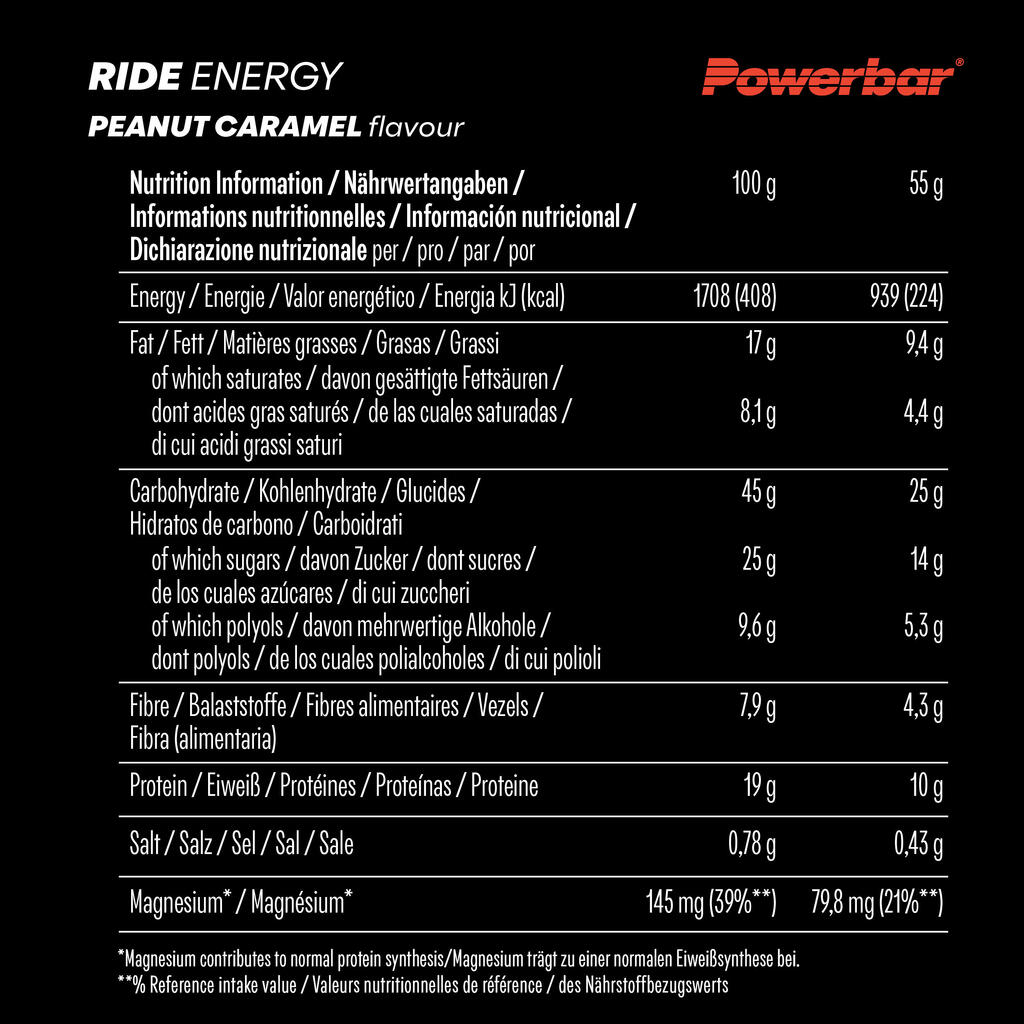 Discover the Ride energy bar from PowerBar, enriched with proteins, carbohydrates, caramel and magnesium, to support your sporting performance.