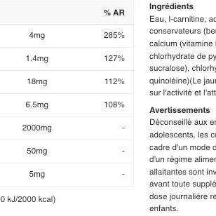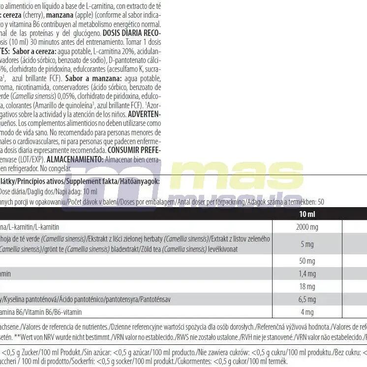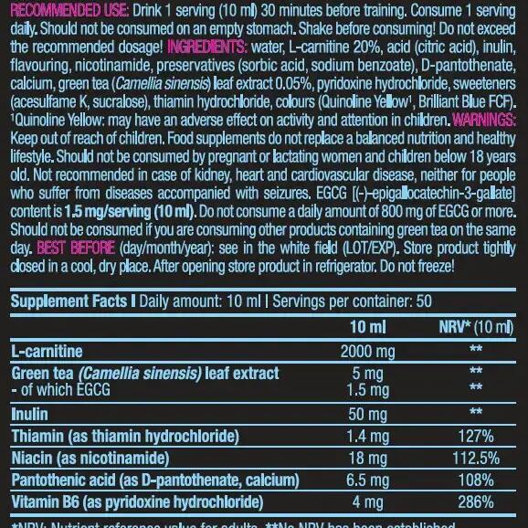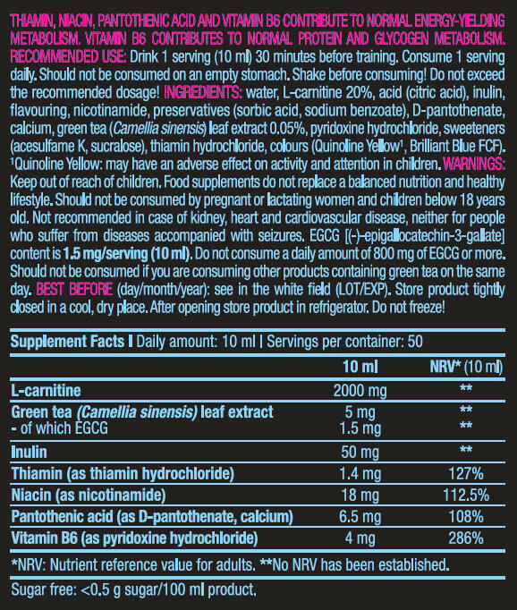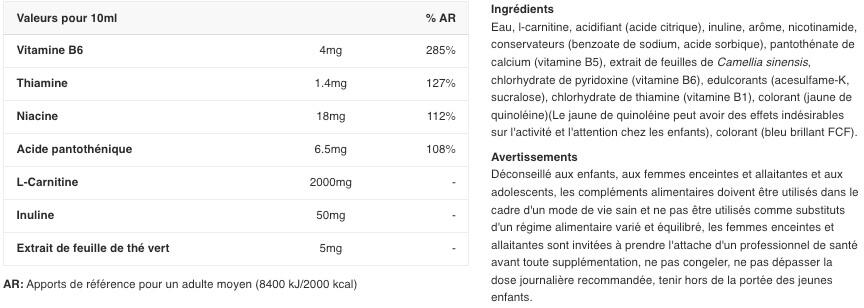 Nutritional information Per 1 Dose (10 ml) Per 10 ml L-Carnitine 2000 mg Green Tea 5 mg Inulin 50 mg Thiamine 1,4 mg Niacin 18 mg Pantothenic acid 6.5 mg Vitamin B6 4 mg