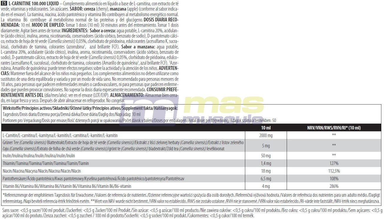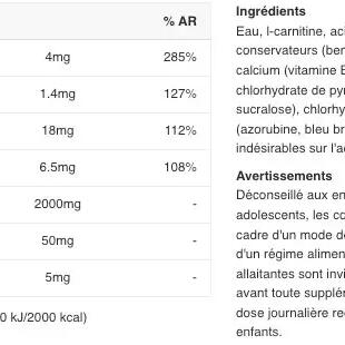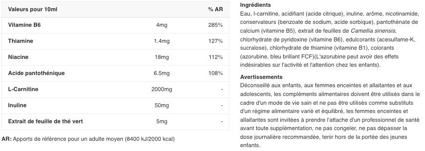 Nutritional information Per 1 Dose (10 ml) Per 10 ml L-Carnitine 2000 mg Green Tea 5 mg Inulin 50 mg Thiamine 1,4 mg Niacin 18 mg Pantothenic acid 6.5 mg Vitamin B6 4 mg