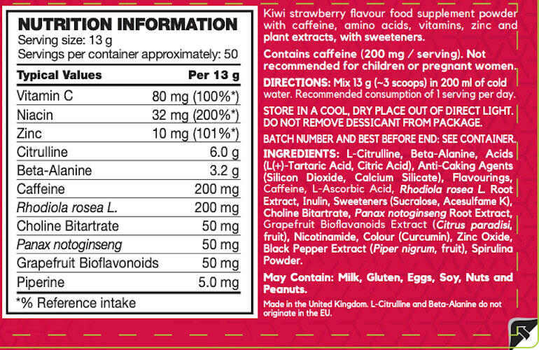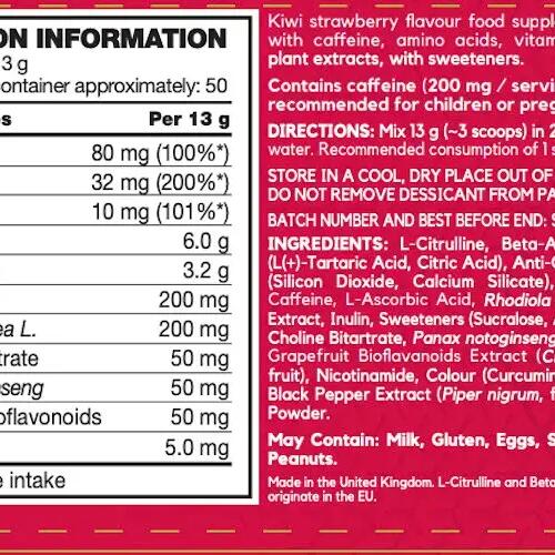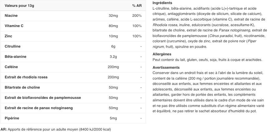 Purple Power ingredients: L-citrulline, beta-alanine, acidulants (L(+)-tartaric acid, citric acid), anti-caking agents (silicon dioxide, calcium silicate), flavourings, caffeine, L-ascorbic acid, Rhodiola rosea root extract, inulin, color (beet red), sweeteners (sucralose, acesulfame-K), choline bitartrate, Panax root extract, grapefruit bioflavonoids extract(citrus paradisi fruit), nicotinamide, spirulina powder, zinc oxide, black pepper extract(Piper nigrum, fruit). Green Burst ingredients: L-citrulline, beta-alanine, acidulants (L(+)-tartaric acid, citric acid), anti-caking agents (silicon dioxide, calcium silicate), flavourings, caffeine, L-ascorbic acid, Rhodiola rosea root extract, inulin, sweeteners (sucralose, acesulfame-K), choline bitartrate, Panax root extract, grapefruit bioflavonoids extract(citrus paradisi fruit), nicotinamide, colorant (curcumin), spirulina powder, zinc oxide, black pepper extract(Piper nigrum, fruit). Purple Power ingredients: L-citrulline, beta-alanine, acidulants (L(+)-tartaric acid, citric acid), anti-caking agents (silicon dioxide, calcium silicate), flavourings, caffeine, L-ascorbic acid, Rhodiola rosea root extract, inulin, colorants (beet red, beta-carotene), sweeteners (sucralose, acesulfame-K), choline bitartrate, Panax root extract, grapefruit bioflavonoids extract(citrus paradisi fruit), nicotinamide, zinc oxide, black pepper extract(Piper nigrum, fruit).
