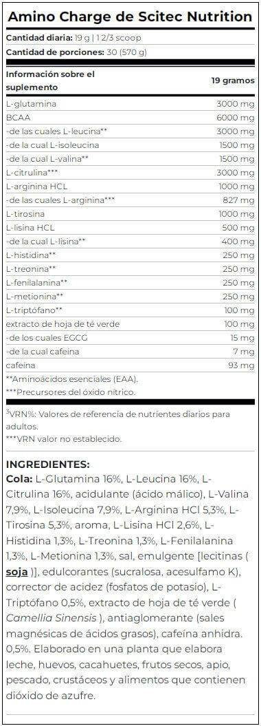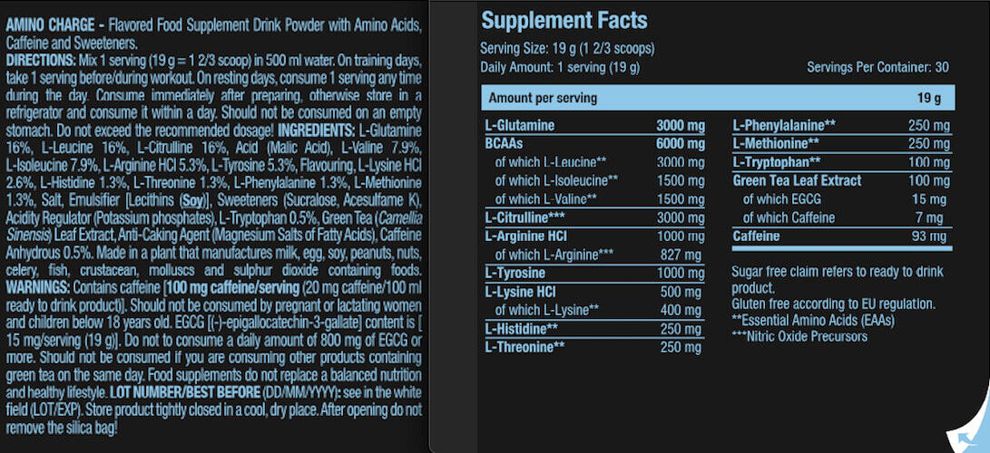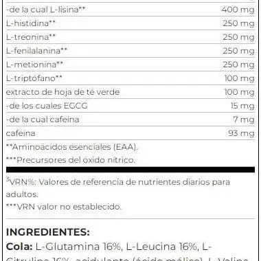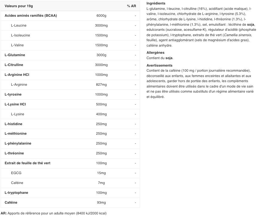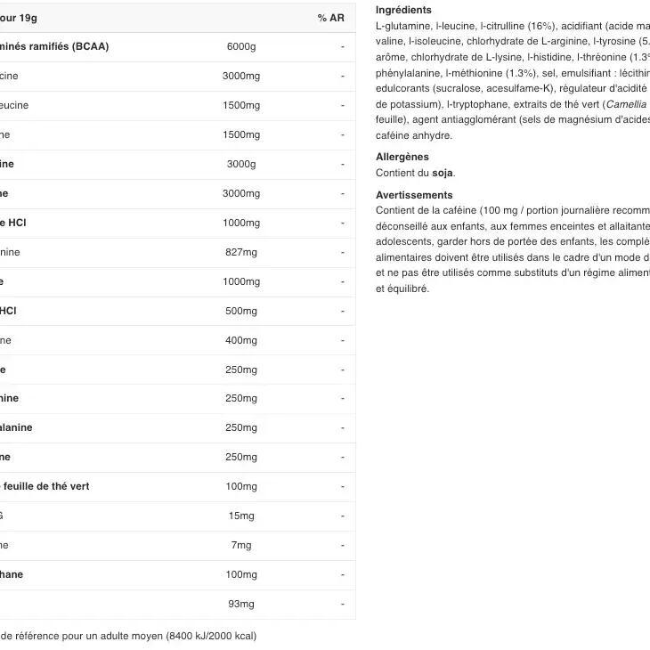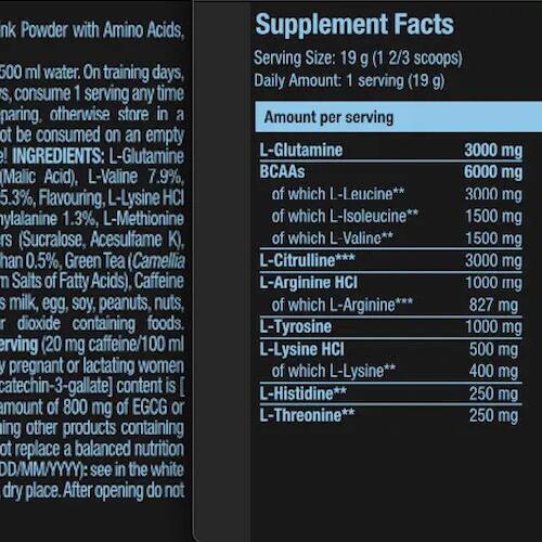 Cola ingredients: L-glutamine 16%, L-leucine 16%, L-citrulline 16%, malic acid, L-valine 7.9%, L-isoleucine 7.9%, L-arginine HCL 5.3%, L-tyrosine 1.3%, L-phenylalanine 1.3%, L-methionine 1.3%, salt, emulsifiers ( soy lecithin), sweeteners (sucralose, acesulfame K), acidity regulator (potassium phosphate), L-tryptophan 0.5%, green tea extract, anti-caking agent (magnesium salts of fatty acids), caffeine anhydrous 0.5%. Blue Raspberry ingredients: L-Glutamine 16%, L-Leucine 16%, L-Citrulline 16%, L-Valine 7.9%, L-Isoleucine 7.9%, Flavours, Acid (citric acid), L-Arginine HCI 5.3%, L-Tyrosine 5.3%, L-Lysine HCI 2.6%, L-Histidine 1.3%, L-Threonine 1.3%, L-Phennylalanine 1.3%, L-Methionine 1.3%, sweeteners (Sucralose, Acesulfame K), salt, acidity regulator (potassium phosphates), L-Tryptophan 0.5%, green tea leaf extract (Camellia Sinensis), anti-caking agent (magnesium salts of fatty acids), emulsifier [lecithin(Soya)], caffeine anhydrous 0.5%. Ingredients Apple: L-Glutamine 16%, L-Leucine 16%, L-Citrulline 16%, L-Valine 7,9%, L-Isoleucine 7,9%, Acids (malic acid, citric acid), L-Arginine HCI 5,3%, L-Tyrosine 5,3%, L-Lysine HCI 2,6%, Salt, L-Histidine 1,3%, L-Threonine 1,3%, L-Phennylalanine 1,3%, L-Methionine 1, 3%, sweeteners (Sucralose, Acesulfame K), emulsifier (lecithins(Soya)), acidity regulator (potassium phosphates), L-Tryptophan 0.5%, green tea leaf extract (Camellia Sinensis), anti-caking agent (magnesium salts of fatty acids), caffeine anhydrous 0.5%.