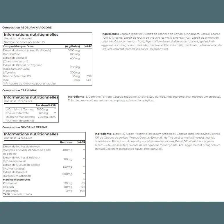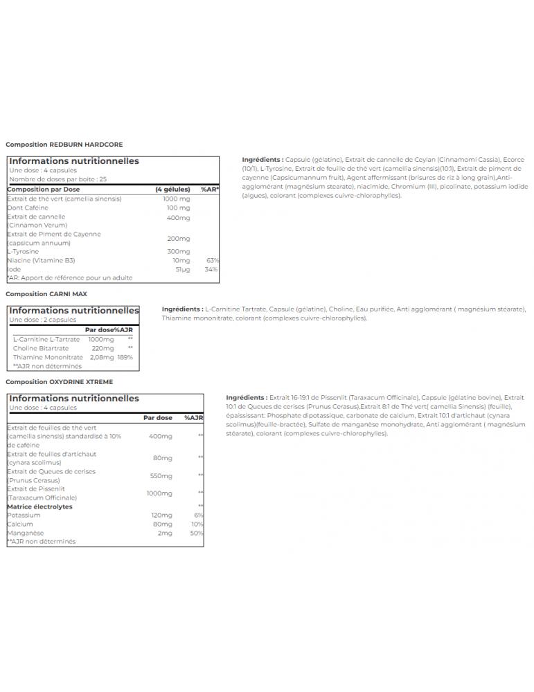 Composition REDBURN HARDCORE NUTRITIONAL INFORMATION One portion: 4 capsules Per 4 capsules AR%* Green tea leaf extract (Camellia sinensis) of which polyphenols of which EGCG of which caffeine 1,000 mg 500 mg 150 mg 70 mg ** ** ** ** Cinnamon bark extract (Cinnamomum Zeylanicium) 280 mg ** Cayenne pepper extract (Capsicum annuum) of which capsaicin 200 mg 4 mg ** L-Tyrosine 200 mg ** Caffeine anhydrous 100 mg ** Niacin (Vitamin B3) 10 mg 63% Iodine 64,2 µg 43% Chromium 6 µg 15% Total caffeine 170 mg ** * RA : Reference intake for an adult. **Values not established. Composition OXYDRINE XTREME: NUTRITIONAL INFORMATION One portion : 4 capsules Per 4 capsules%AR* Dandelion extract (Taraxacum Officinale) including flavonoids 1,000 mg 200 mg ** ** Cherry stem extract (Prunus Cerasus) 550 mg ** Green tea leaf extract (Camellia sinensis) including polyphenols including EGCG including caffeine 400 mg 200 mg 60 mg 28 mg ** ** ** ** Artichoke leaf extract (Cynara Scolimus) 80 mg ** Manganese