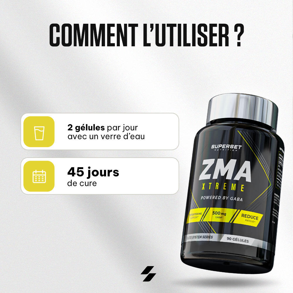 ZMA XTREME (90 CAPS), a well-balanced combination of nutrients ZMA XTREME (90 CAPS) from the French brand Superset Nutrition combines three essential nutrients for athletes: zinc (15 mg), magnesium (250 mg) and vitamin B6 (2 mg), all carefully dosed to deliver optimum results.This complex is a must-have for all those seeking to :Improve their physical performanceMake up for deficiencies caused by intensive trainingSupport their muscular developmentAs an added bonus, the formula is enriched with GABA to maximize recovery and support your nervous system after intense sessions.Supporting performance and muscle development!The combination of these three active ingredients is particularly well known to athletes and bodybuilders seeking long-term performance. It acts synergistically to :Maintain optimal testosterone levels: the key hormone for muscle gain and physical performance.Promotes protein synthesis: essential for muscle development and recovery.Contribute to the proper functioning of muscular contraction: thanks to magnesium, for maximum performance during every session.Reduce fatigue: the combined action of magnesium and vitamin B6 helps to intensify training.Endurance booster: to push your limits during prolonged efforts. Enriched with GABA to support recoveryZMA XTREME (90 CAPS) from Superset Nutrition doesn't just offer a classic blend of zinc, magnesium and vitamin B6. It's enriched with 500 mg of GABA (gamma-aminobutyric acid) per daily dose, a major asset for :Improve the quality of your sleepSpeed up your recoveryStudies suggest that GABA may even stimulate the secretion of growth hormone (GH) during deep sleep. This hormone is essential for athletes, as it promotes muscle development and can help reduce body fat.Scientific references: Maares, M., & Haase, H. (2021). Role of zinc in the regulation of muscle metabolism and functional recovery after exercise: A review. Nutrients, 13(3), 745.Newhouse, I. J., & Finstad, E. W. (2000). Magnesium and exercise: An update. Sports Medicine, 36(10), 867-893. Veronese, N., Berton, L., Carraro, S., Bolzetta, F., De Rui, M., Perissinotto, E., ... & Sergi, G. (2014). Effect of magnesium supplementation on muscle fitness: A meta-analysis. Magnesium Research, 27(3), 84-91.Leklem, J. E. (2006). Vitamin B6 in exercise and sports. International Journal of Sport Nutrition and Exercise Metabolism, 16(3), 342-357.Manore, M. M., & Leklem, J. E. (1981). Effect of vitamin B6 deficiency on exercise performance. Journal of Applied Physiology, 51(1), 68-72.Cavagnini, F., Invitti, C., Pinto, M., Dubini, A., Marelli, A., & Pagani, G. (1980). Effect of acute and repeated administration of gamma-aminobutyric acid (GABA) on growth hormone and prolactin secretion in man. Acta Endocrinologica, 93(2), 149-154. Powers, M. E., Yarrow, J. F., McCoy, S. C., & Borst, S. E. (2008). Growth hormone isoform responses to GABA ingestion at rest and after exercise. Medicine and Science in Sports and Exercise, 40(1), 104-110.'>,