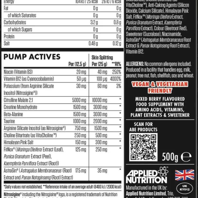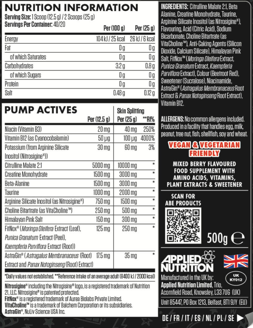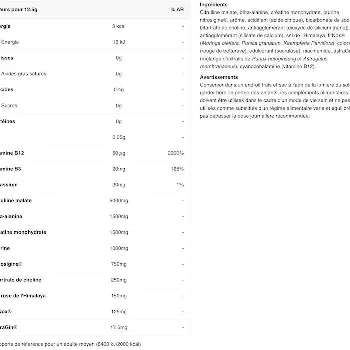 Tigger Blood ingredients: Citrulline malate, beta-alanine, creatine monohydrate, taurine, nitrosigine®, flavour, acidifier (citric acid), sodium bicarbonate, choline bitartrate, anti-caking agent (silicon dioxide [nano]), anti-caking agent (calcium silicate),Himalaya salt, fitNox® (Moringa oleifera, Punica granatum, Kaempferia Parviflora), color (beet red), sweetener (sucralose), niacinamide, astraGin® (blend of Panax notoginseng and Astragalus membranaceus extracts), cyanocobalamin (vitamin B12).Red Hawaiian ingredients: Citrulline malate, beta-alanine, creatine monohydrate, taurine, nitrosigine®, flavour, acidifier (citric acid), sodium bicarbonate, choline bitartrate, anti-caking agent (silicon dioxide [nano]), anti-caking agent (calcium silicate),Himalaya salt, fitNox® (Moringa oleifera, Punica granatum, Kaempferia Parviflora), color (beet red), sweetener (sucralose), niacinamide, astraGin® (blend of Panax notoginseng and Astragalus membranaceus extracts), cyanocobalamin (vitamin B12).Blue Razz ingredients : Citrulline malate, beta-alanine, creatine monohydrate, taurine, nitrosigine®, flavour, acidifier (citric acid), sodium bicarbonate, choline bitartrate, anti-caking agent (silicon dioxide [nano]), anti-caking agent (calcium silicate),Himalaya salt, fitNox® (Moringa oleifera, Punica granatum, Kaempferia Parviflora), sweetener (sucralose), niacinamide, astraGin® (blend of Panax notoginseng and Astragalus membranaceus extracts), colorant (FCF brilliant blue), cyanocobalamin (vitamin B12).