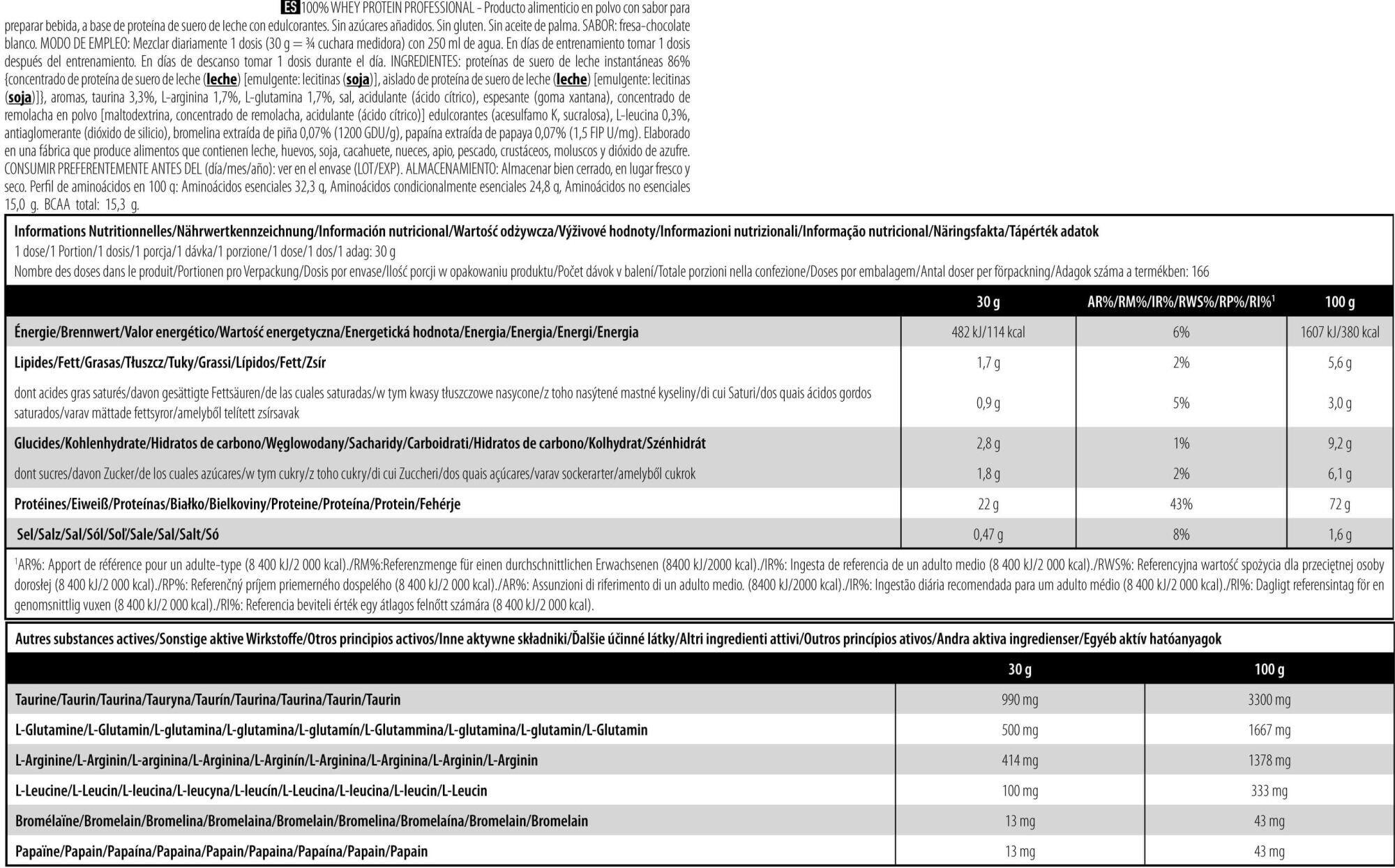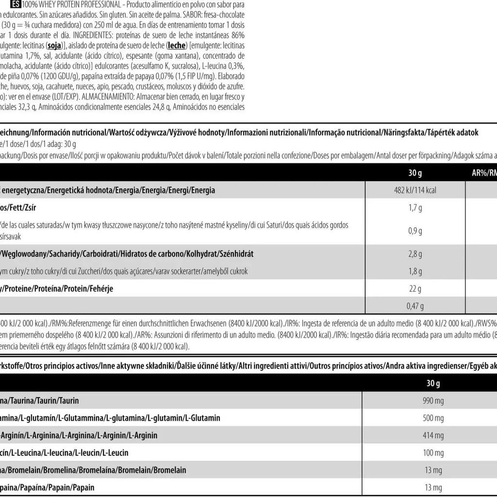 Want to build muscle? Scitec Nutrition has developed a professional protein based on whey concentrate andwhey isolate specifically for bodybuilders.Ideal for promoting muscle growth and lean mass gain, 100% Whey Protein Professional contains all the nutrients essential for muscle development: essential amino acids and branched-chain amino acids also known as BCAAs (Histidine, Isoleucine, Leucine, Lysine, Methionine, Phenylalanine, Threonine, Tryptophan, Valine), as well as two digestive enzymes for perfect assimilation and digestion of the supplement.This protein powder supplement is ideal for bodybuilding/fitness activities, helping to build lean muscle, tone and strengthen the skeleton.Derived from milk protein, whey concentrate and whey isolate are the world's best-selling whey types.In 5kg tubs, 100% Whey Protein Professional is ideal for heavy protein powder consumers.Its low fat and carbohydrate content makes 100% Whey Protein Professional a benchmark for lean mass gain.Available in chocolate, vanilla, strawberry, banana, caramel, chocolate coconut, strawberry white chocolate, cappuccino, chocolate hazelnut, vanilla red fruit, cookies & cream.