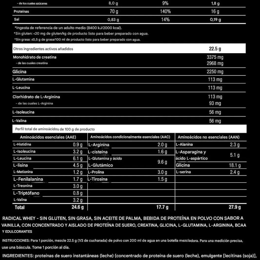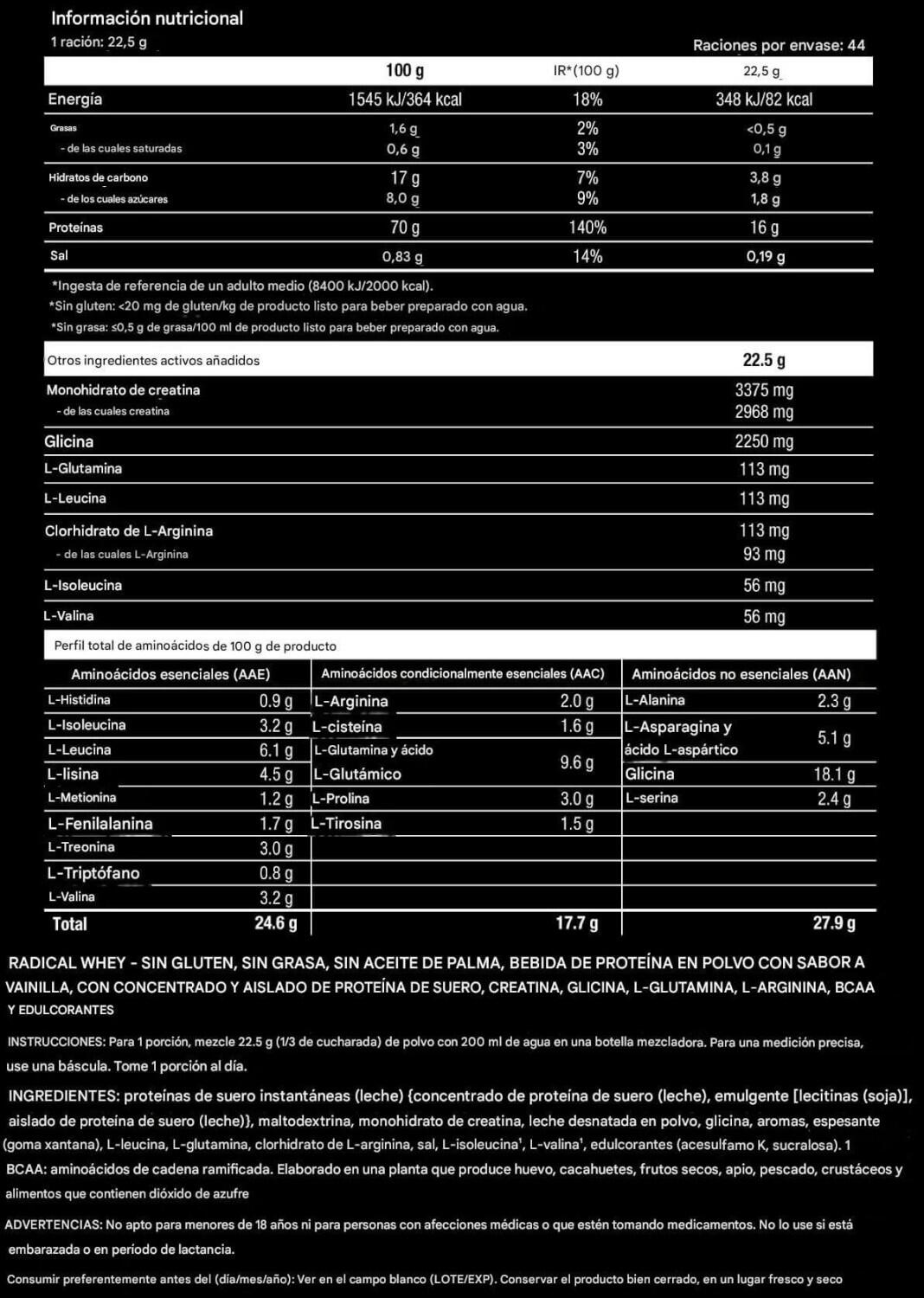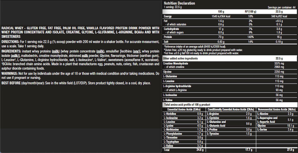 Scitec's Radical Whey combines whey protein concentrate and isolate with creatine and BCAAs, ideal for those seeking quality and a complete nutritional profile