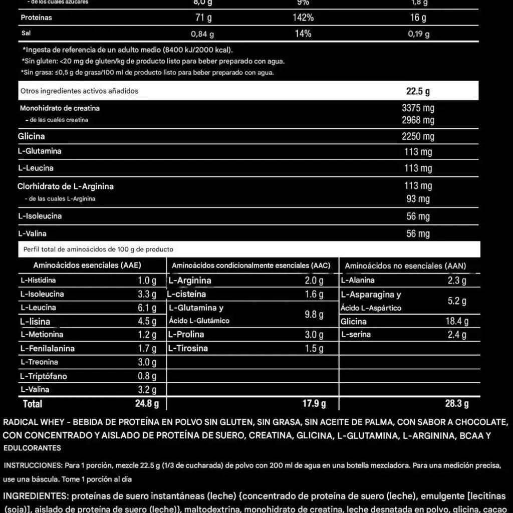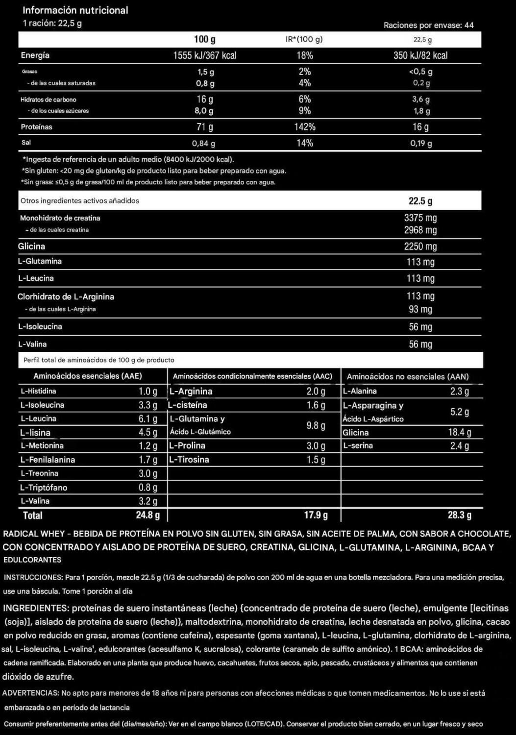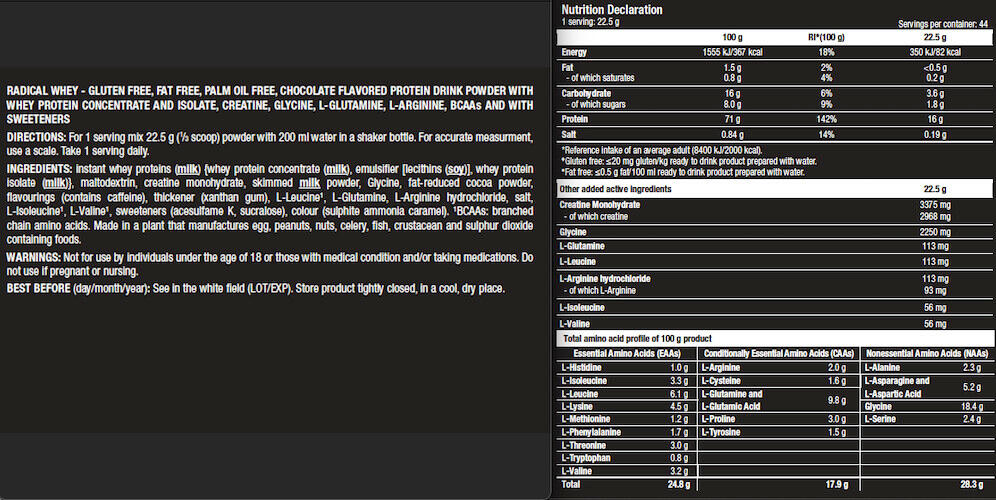 Scitec's Radical Whey combines whey protein concentrate and isolate with creatine and BCAAs, ideal for those seeking quality and a complete nutritional profile