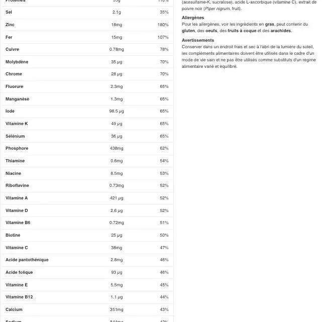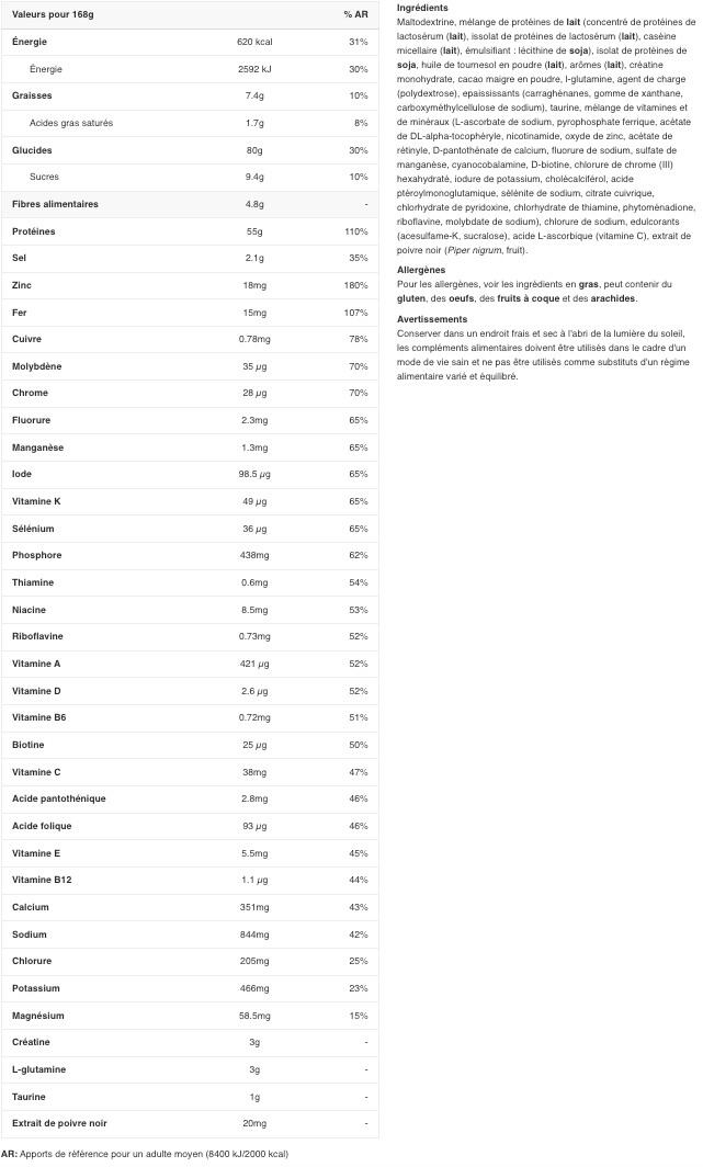 maltodextrin, milk protein blend( WHEY PROTEIN CONCENTRATE (MILK), WHEY PROTEIN ISOLATE (MILK), MICELLAR CASEIN (MILK), emulsifier( SOYA LECITHIN)), SOYA PROTEIN ISOLATE, sunflower oil powder( MILK), flavourings( MILK), creatine monohydrate, fat-reduced cocoa powder, L-glutamine, bulking agent( polydextrose), thickener( carrageenan, xanthan gum, sodium carboxymethylcellulose), taurine, vitamin & mineral blend( sodium L-ascorbate, ferric pyrophosphate, DL-alpha-tocopheryl acetate, nicotinamide, zinc oxide, retinyl acetate, calcium D-pantothenate, sodium fluoride, manganese sulphate, cyanocobalamin, D-biotin, chromium(III)chloride hexahydrate, potassium iodide, cholecalciferol, pteroylmonoglutamic acid, sodium selenite, cupric citrate, pyridoxine hydrochloride, thiamin hydrochloride, phytomenadione, Riboflavin, sodium molybdate), sodium chloride, sweeteners( acesulfame K, sucralose), L-ascorbic acid, black pepper extract( Piper nigrum)