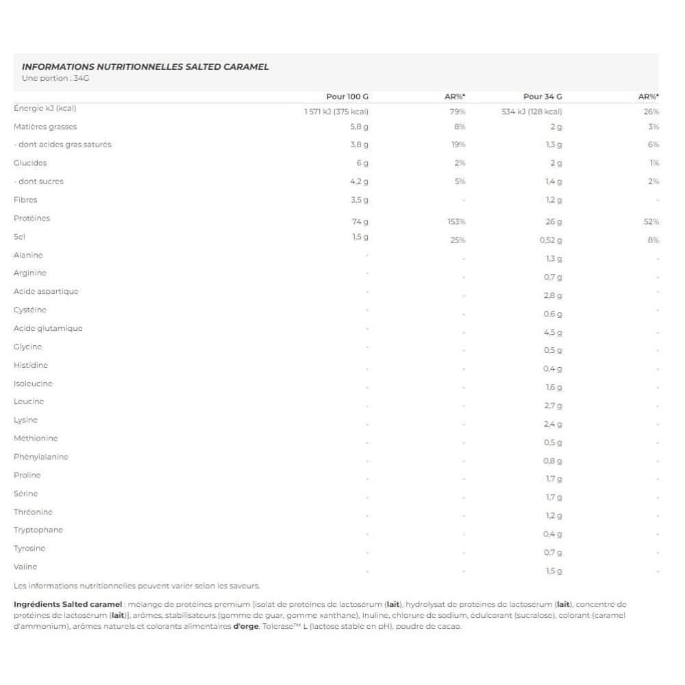 NUTRITIONAL INFORMATION VANILLA One portion : 34G For 100 G AR%* For 34 G AR%* Energy kJ (kcal) 1 589 kJ (376 kcal) 19% 540 kJ (128 kcal) 6% Fat - of which saturated fatty acids 5.1 g 3.5 g 7% 18% 1.7 g 1.2 g 2% 6% Carbohydrates - of which sugars 5,9 g 4.8 g 2% 5% 2 g 1.6 g 1% 2% Fiber 5.4 g - 1.8 g - Protein 74 g 148% 25 g 50% Salt 1 g 16% 0.3 g 6% Alanine - - 1.3 g - Arginine - - 0.6 g - Aspartic acid - - 2.8 g - Cysteine - - 0,4 g - Glutamic acid - - 4.3 g - Glycine - - 0.5 g - Histidine - - 0.4 g - Isoleucine - - 1.5 g - Leucine - - 2.6 g - Lysine - - 2.3 g - Methionine - - 0.5 g - Phenylalanine - - 0,8 g - Proline - - 1,5 g - Serine - - 1,3 g - Threonine - - 1,8 g - Tryptophan - - 0,4 g - Tyrosine - - 0,7 g - Valine - - 1,4 g - Nutritional information may vary according to flavor. NUTRITIONAL INFORMATION WHEYTELLA One portion : 34G For 100 G AR%* For 34 G AR%* Energy kJ (kcal) 1 566 kJ (371 kcal) 19% 533 kJ (126 kcal) 6% Fat - of which saturated fatty acids 5.5 g 3.7 g 8% 19% 1