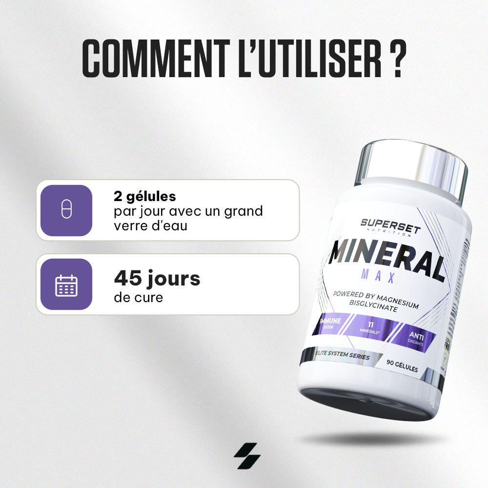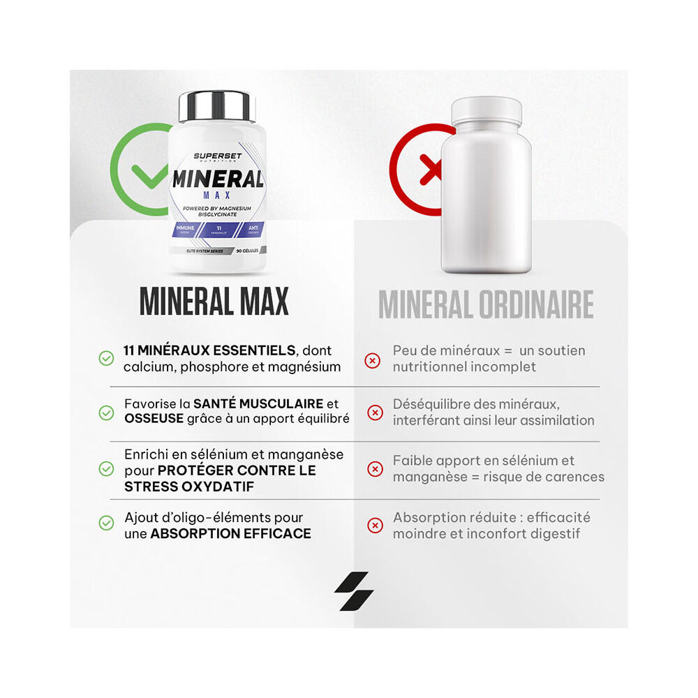 The winning trio: calcium, phosphorus, magnesiumThis MINERAL MAX (90 CAPS) is a formula of ingredients containing 11 essential minerals, each with a specific role in supporting your health and well-being on a daily basis, including the trio calcium, phosphorus and magnesium, popular with athletes:Optimize your energy by supporting your ATP production, essential for your physical and sporting activities.Ensures efficient muscle contraction, facilitating movement and physical performance.Promotes muscle relaxation, reducing stress and improving your general well-being.Strengthen your bones and teeth by helping to keep them strong and healthy.Each of these 11 minerals provides between 14% and 149% of the daily reference intake required for an adult.+ 7 essential minerals also known as trace elementsThis dietary supplement developed by the nutrition experts at Superset Nutrition contains essential minerals and trace elements, each with recognized roles in supporting your health:Well-being and protection against oxidative stress: selenium and manganese.Energy and metabolism: Iodine, iron, magnesium, chromium and molybdenum.Growth and development: Iodine and zinc.Body balance: Zinc and iodine.Cognitive function: Iodine and iron.It should be noted that trace elements, although vital for health, are required in very small quantities, unlike minerals, which are needed in larger quantities. Who needs MINERAL MAX (90 CAPS)?Depending on your nutritional needs, age, state of health and lifestyle, multi-mineral supplements may be necessary.People wishing to maintain optimal nutritional balance and general well-being.People who don't eat enough fruit, vegetables, whole grains and proteins.People under stress or subject to polluted environments.Athletes, sportspeople and very active people.Pregnant and breast-feeding women.The elderly.'>,So, do you need to supplement your diet with a multi-mineral like MINERAL MAX (90 CAPS)?'>,