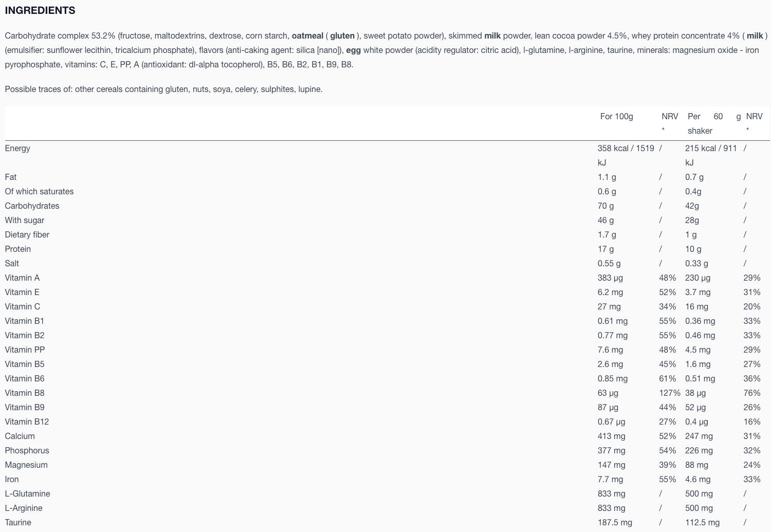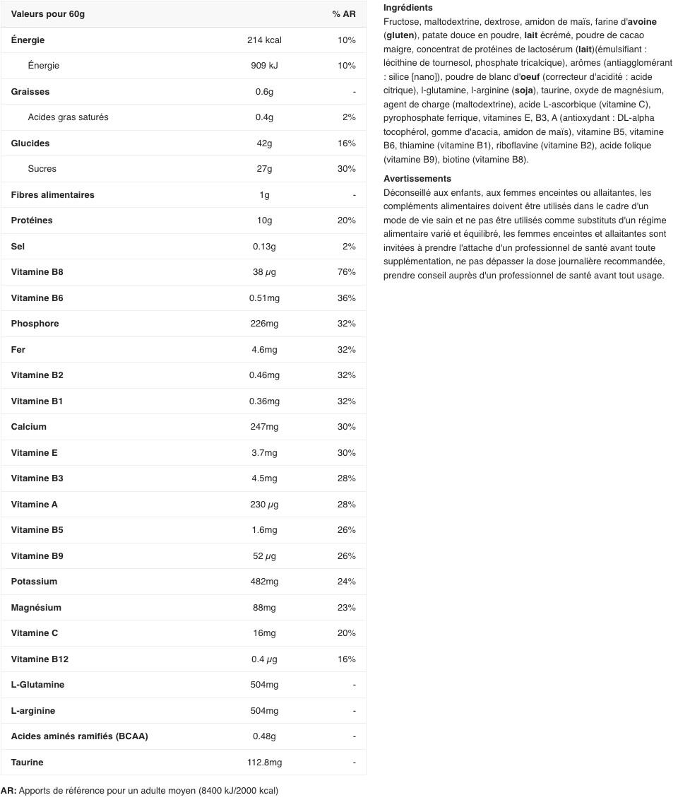 Gainer Max (1.1 kg) is a gainer from the nutritional supplements range of the renowned French brand EAFIT.Gainers are widely recognized as valuable aids for people seeking to increase their weight, notably by promoting muscle development and facilitating convenient, effective daily calorie intake.EAFIT Gainer Max stands out for its generous carbohydrate composition, with up to 43g of carbohydrates per shaker, depending on flavor. This gainer combines a unique matrix of 6 carbohydrate sources, combining high-glycemic index sugars such as corn starch, dextrose and maltodextrin, with low-glycemic index sugars such as fructose, oats and sweet potato. This combination enables rapid assimilation of high-GI sugars for immediate energy intake, followed by a more gradual release of energy from low-GI sugars. With around 217 kcal and 10 g of protein per serving, depending on flavour, Gainer Max helps you reach your daily calorie target for muscle growth and weight gain.What's more, Gainer Max offers a complete essential amino acid (BCAA) profile, including arginine, taurine and glutamine. Amino acids are crucial for muscle growth, repair and recovery.This gainer is enriched with 11 vitamins and minerals essential to the body's proper functioning. EAFIT's objective was to design a complete gainer, which would therefore require no additional dietary supplements.In addition to its nutritional qualities, Gainer Max is distinguished by its appetizing flavours, available in three options: Caramel, Double Chocolate and Vanilla Hazelnut. Its shaker format makes it a convenient and enjoyable choice for supplementing your diet and achieving your muscle mass goals.