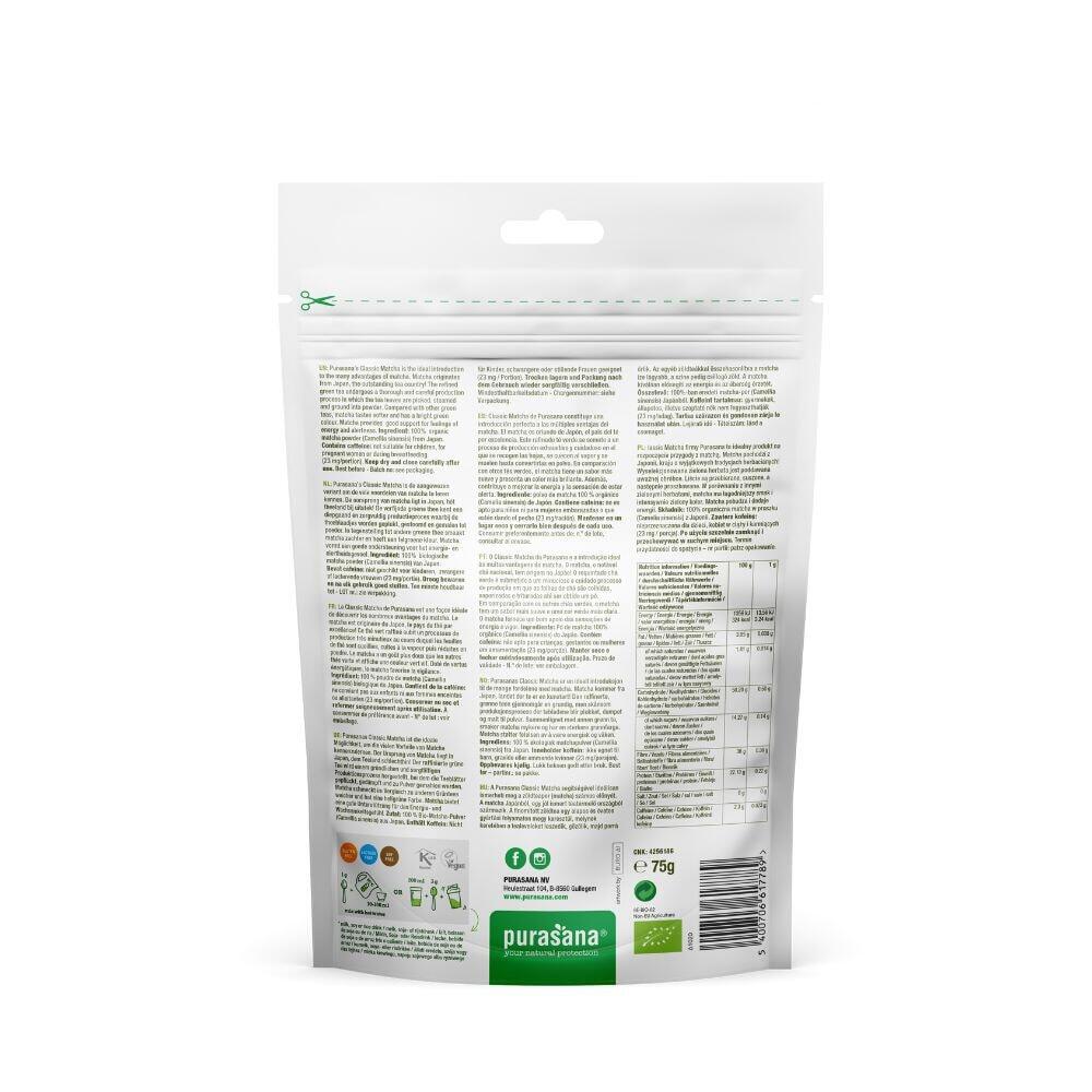 Matcha Powder (75g) by Purasana is a green tea from Japan. When harvesting green tea, only the best tea leaves are selected. High-quality matcha is very fine, smooth and silky. Poor-quality matcha is a little rough and grainy between the fingers.This finely ground matcha contains theanine, which acts like caffeine for long-lasting energy and stimulation without the jittery effect.Matcha is a shade tea. 2 weeks before harvest, the tea bushes are placed in the shade with mats or sails. The bushes react to this by producing additional chlorophyll. Chlorophyll, among other things, gives the tea its green color.Matcha has a sweet and salty taste. Japanese green tea powder is 100 times richer in antioxidants than ordinary green tea, and 1 cup of matcha is equal to 10 cups of green tea. In addition to antioxidants, matcha is also rich in vitamins (A, B, C, D), fiber, chlorophyll (leaf green) and minerals such as magnesium, chromium, calcium and zinc. It detoxifies ly and effectively, and stimulates the metabolism. Matcha helps you feel awake and energized.100% Matcha green tea.