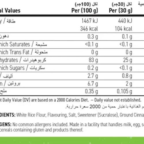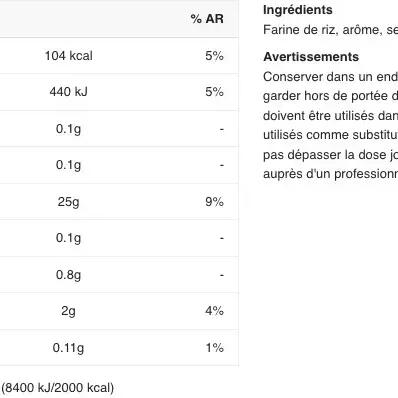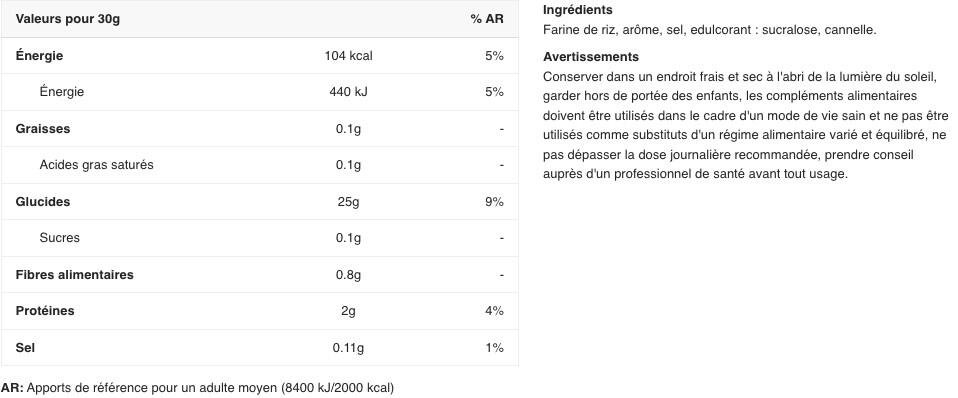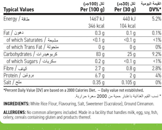 Ingredients - golden syrup flavor: white rice flour, flavor, salt, color (plain caramel), sweetener: sucralose.Ingredients - raspberry ripple flavor : white rice flour, flavor, salt, sweetener: sucralose.Ingredients - toffee cookie flavor: white rice flour, flavor, skim milk powder, salt, color (plain caramel), sweetener: sucralose.Ingredients - plain flavor: white rice flour.Ingredients - apple crumble flavor: white rice flour, flavor, salt, sweetener: sucralose, cinnamon.