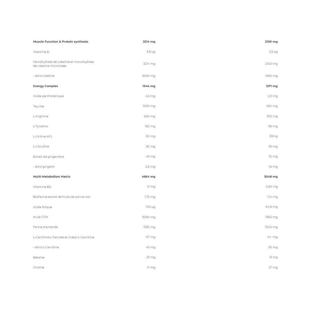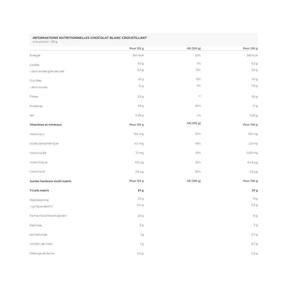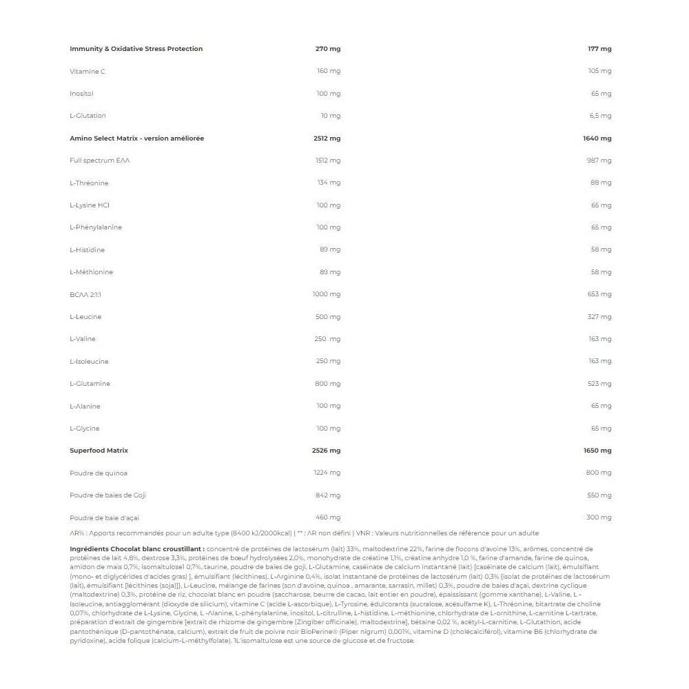 Chocolate ingredients : Whey protein concentrate 33%, Maltodextrin 19%, Oat flakes flour 13%, Defatted cocoa powder, Milk protein concentrate 4.8%, Flavours, Dextrose 3.3%, Medium-chain triglyceride oil powder 2.8% [triglycérides à chaîne moyenne, agent de charge (gomme d'acacia), agent anti-agglomérant (dioxyde de silicium)], Hydrolyzed beef protein 2%, Creatine Monohydrate 1.1%, Creatine anhydrous 1%, Almond flour, Quinoa powder, Corn starch 0.7%, PalatinoseTM (Isomaltulose*) 0.7%, taurine, goji berry powder, L-glutamine, calcium caseinate [( calciumcaseinate, emulsifier (mono- and diglycerides of fatty acids)], emulsifier (lecithins), magnesium carbonate, L-arginine 0.4%, instant whey protein isolate 0.3% [ whey protein isolate, emulsifier: lecithins(soya)], L-leucine, ModCarbTM flour blend 0.3% ( oat bran, quinoa, amaranth, buckwheat, millet), acai berry powder, Cluster Dextrin® (maltodextrin) 0.3%, Rice Protein, Thickener (Xanthan Gum), L-Valine, L-Isoleucine, Sweeteners (Sucralose, Acesulfame K), Beta-Alanine 0.13%, L-Ascorbic Acid, L-Tyrosine, L-Threonine, Choline Bitartrate 0.07%, L-Lysine HCl, L-Glycine, L-Alanine, L-Phenylalanine, Inositol, L-Citrulline, L-Histidine, L-Methionine, L-Ornithine HCl, L-Carnitine-L-Tartrate, Ginger Extract [Extrait de Rhizome de Gingembre (Zingiber officinale), Maltodextrine], L-Tryptophan, Betaine, Acetyl-L-Carnitine HCl, L-Glutathione, Red clover (Trifolium pratensel ) leaf and flower extract, Sodium selenite, Zinc bisglycinate (zinc bisglycinate, glycine, acid (citric acid), anti-caking agent (silicon dioxide)), D-pantothenate, calcium, BioPerine® black pepper (Piper Nigrum) fruit extract, cholecalciferol, pyridoxine hydrochloride, chromium picolinate, potassium iodide, calcium L-methylfolate. *Isomaltulose is a source of glucose and fructose.Ingredients banana yoghurt : Whey protein concentrate 33%, maltodextrin 19%, oat flakes flour 13%, low-fat cocoa powder, milk protein concentrate 4.8%, dextrose 3.3%, hydrolyzed beef protein 2%, creatine monohydrate 1.1%, creatine anhydrous 1%, almond flour, quinoa flour, corn starch 0.7%, isomaltulose 0.7%, taurine, goji berry powder, L-glutamine, instant calcium caseinate (milk) (calcium caseinate [lait], emulsifier (mono - and diglycerides of fatty acids)), emulsifier (lecithins), L-arginine 0.4%, instant whey protein isolate (milk) 0.3% [isolat de protéine de lactosérum (lait), émulsifiant [soja]), L-leucine, flour blend (oat bran, quinoa, amaranth, buckwheat, millet) 0,3%, acai berry powder, cyclic dextrin (maltodextrin) 0.3%, rice protein, thickener (xanthan gum), L-valine, L-Isoleucine, anti-caking agent (silicon dioxide), sweeteners (sucralose, acesulfame K), vitamin C (L-ascorbic acid), L-tyrosine, L-threonine, choline bitartrate 0.7%, L-ornithine hydrochloride, L-carnitine L-tartrate, ginger fruit extract preparation [extrait de rhizome de gingembre (Zingiber officinale), maltodextrine], betaine 2.2%, acetyl L-carnitine, L-glutation, pantothenic acid (calcium D-pantothenate), Bioperine black pepper fruit extract (Piper nigrum) 0.001%, vitamin D (cholecalciferol), vitamin B6 (pyridoxine hydrochloride), folic acid (calcium L-methylfolate).