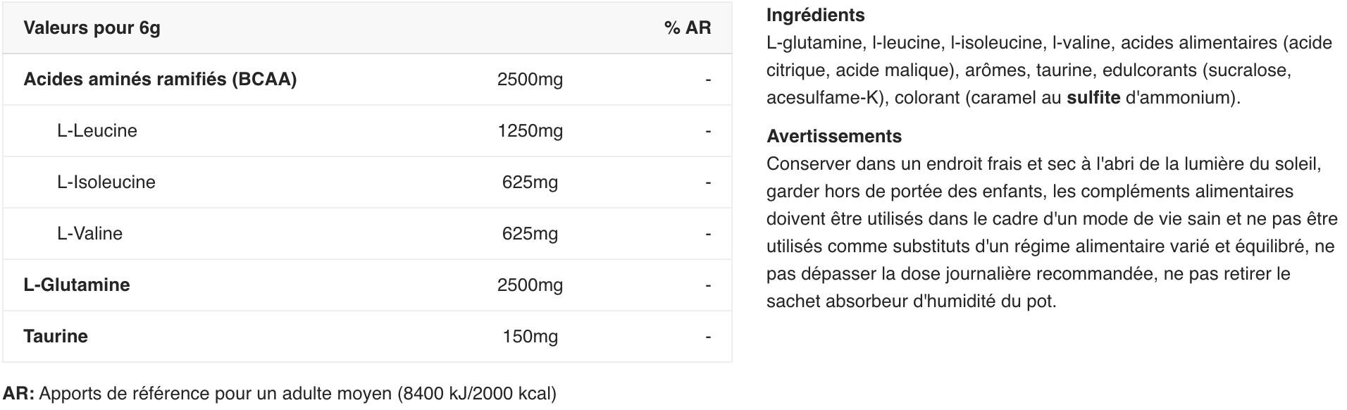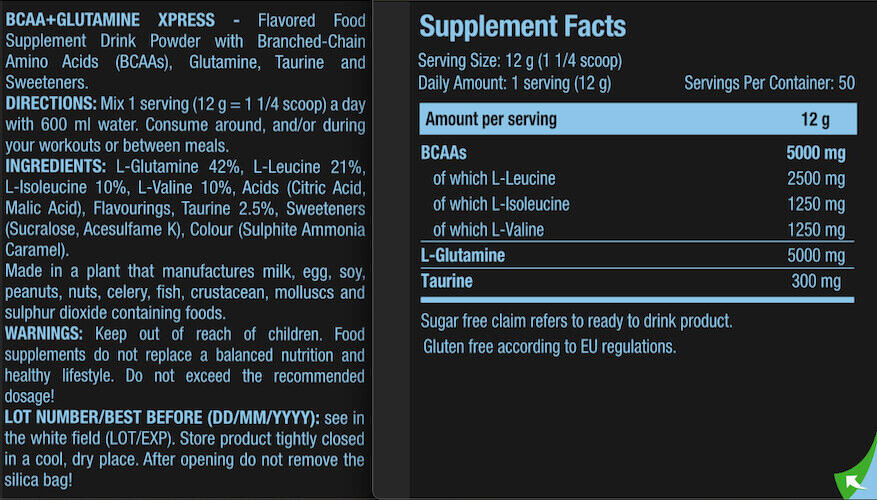 Scitec Nutrition's BCAA + Glutamine Xpress combines 5g of BCAAs in a 2:1:1 ratio with 5g of glutamine per serving, in a sugar-free and gluten-free formula, ideal for those who train intensely