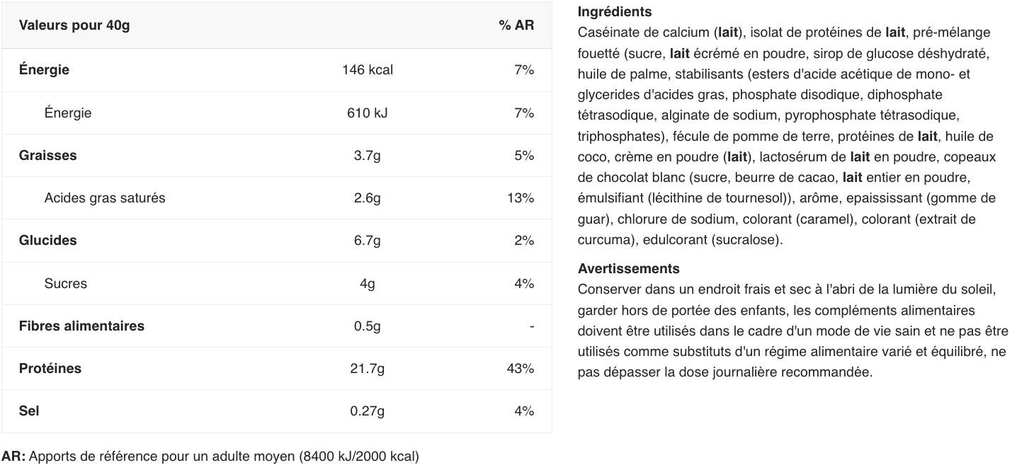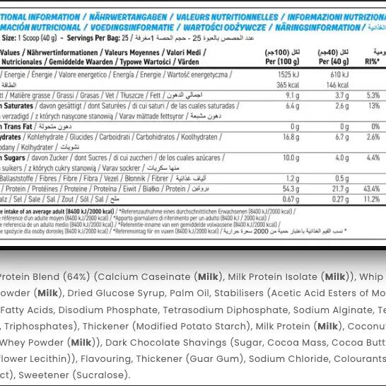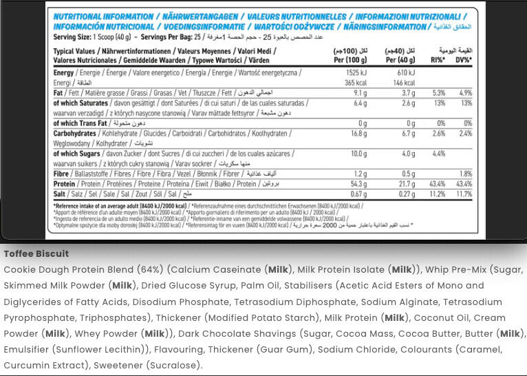 protein blend cookie dough( CALCIUM CASEINATE (MILK), MILK PROTEIN ISOLATE)(64%), whipped cream pre-mix( sugar , SKIMMED MILK POWDER, dried glucose syrup, palm oil, stabilisers( acetic acid esters of mono- and diglycerides of fatty acids, disodium phosphate, tetrasodium diphosphate, sodium alginate, tetrasodium pyrophosphate, triphosphate), thickener( modified potato starch), MILK PROTEIN, coconut oil, CREAM POWDER (MILK), WHEY POWDER (MILK)), dark chocolate chips( sugar , cocoa mass, cocoa butter, BUTTER (MILK), emulsifier( sunflower lecithin)), flavouring, thickener( guar gum), sodium chloride, colours( caramel, curcumin extract), sweetener( sucralose)
