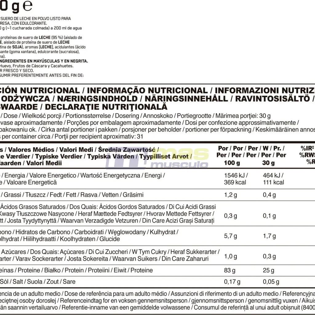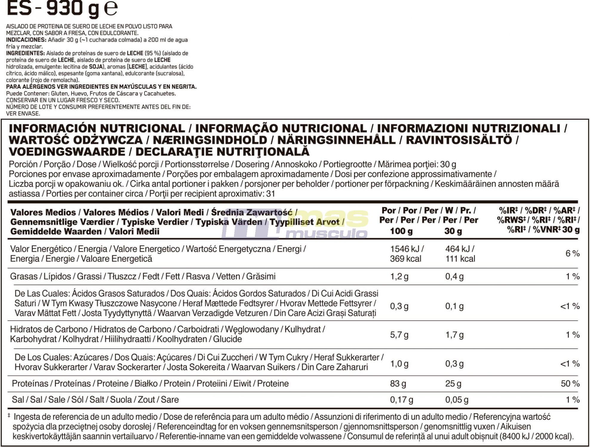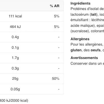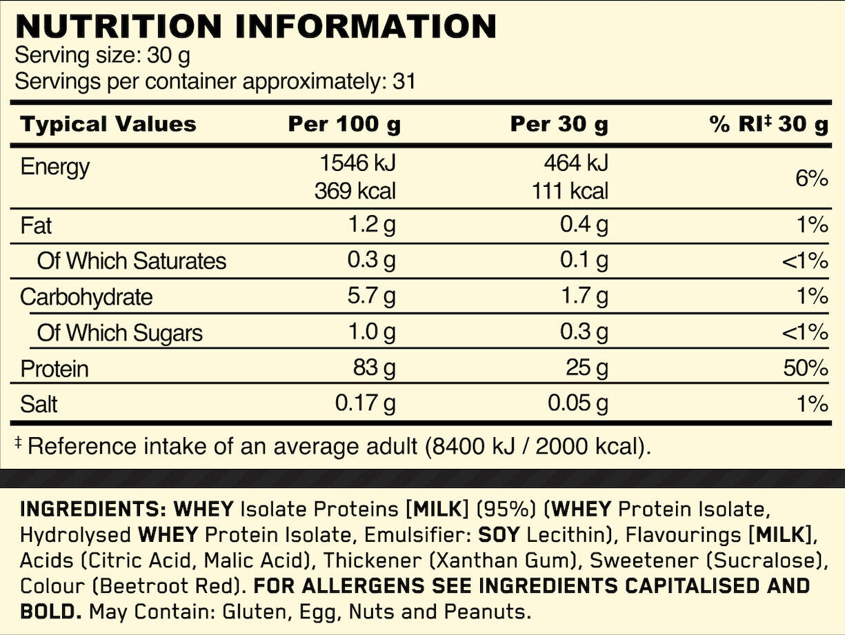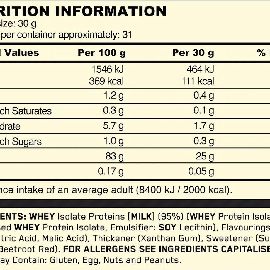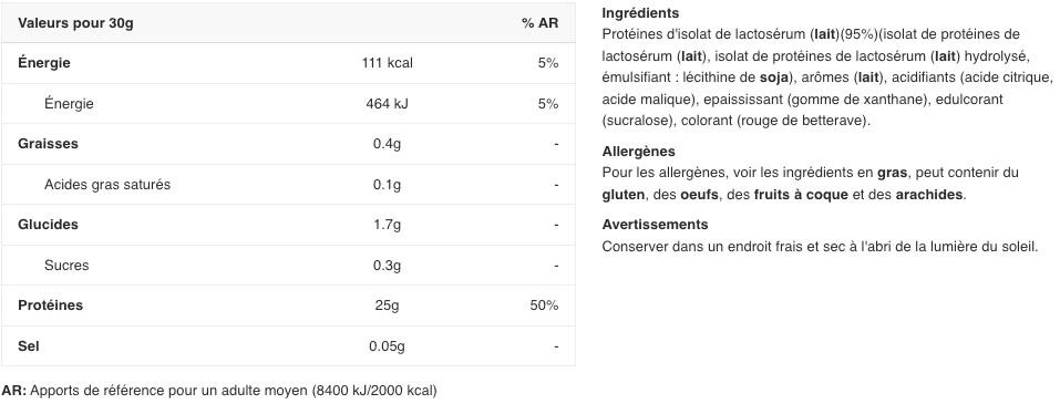 WHEY Isolate Proteins [MILK] (95%) (WHEY Protein Isolate, Hydrolysed WHEY Protein Isolate, Emulsifier: SOY Lecithin), Flavourings [MILK], Acids (Citric Acid, Malic Acid), Thickener (Xanthan Gum), Sweetener (Sucralose), Colour (Beetroot Red).