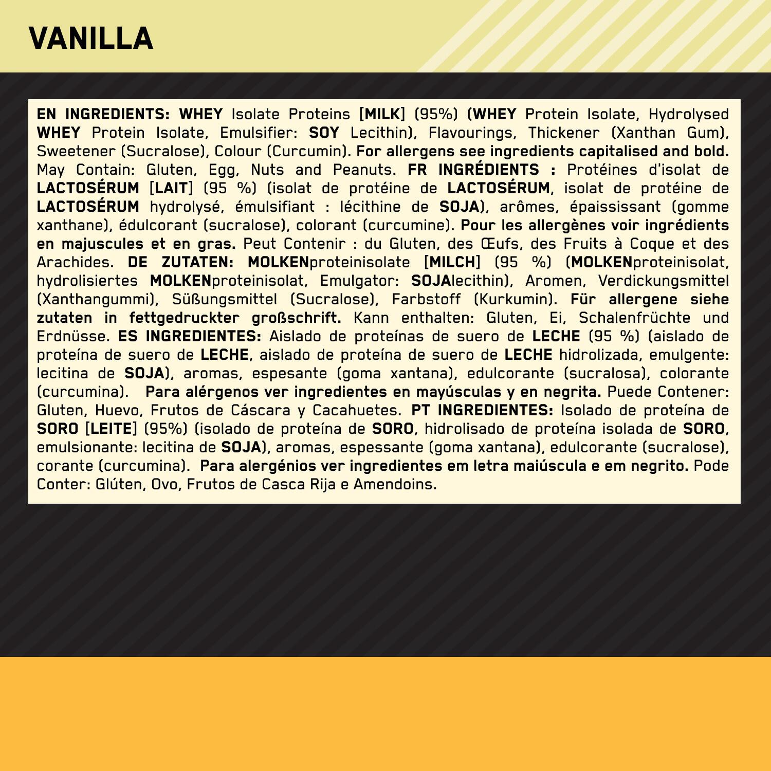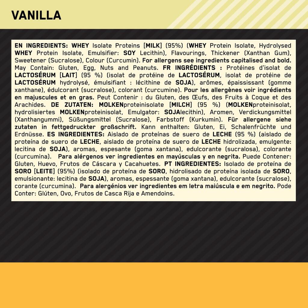 Optimum Nutrition starts by selecting the highest-quality whey proteins, which are then subjected to a series of sophisticated filtration processes that help separate out excess fat and sugar. Part of the whey protein isolate is then hydrolyzed, meaning it is broken down into smaller amino acid chains. The final product is a complete protein containing no more than 0.3 g of sugar, 0.4 g of fat and 83% pure protein per serving. Optimum Nutrition works hard to ensure superior quality so that you can focus on your performance goals. **Instructions for use:** Add 30 g (~1 rounded scoop) to 200 ml of cold water and stir, shake or blend until dissolved.