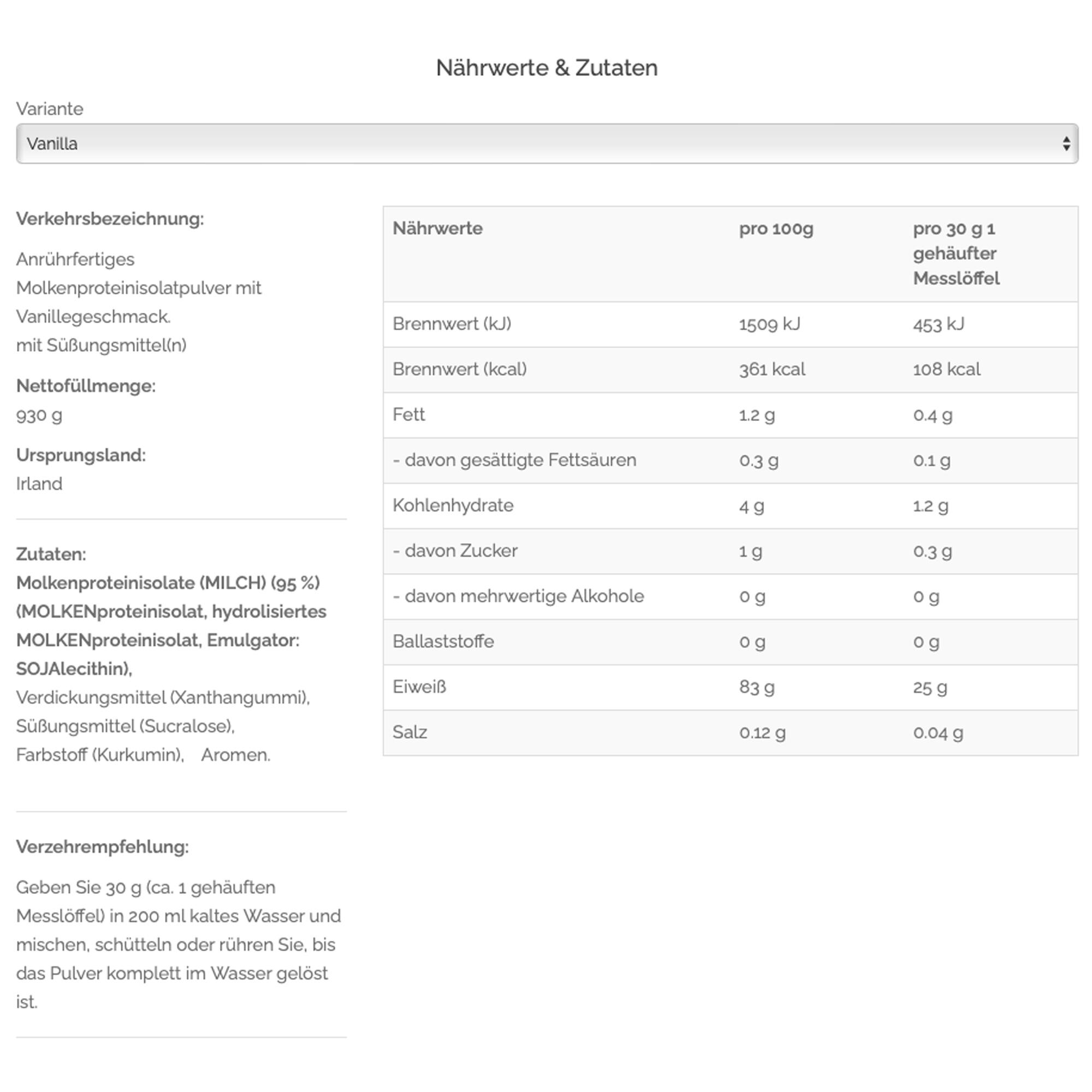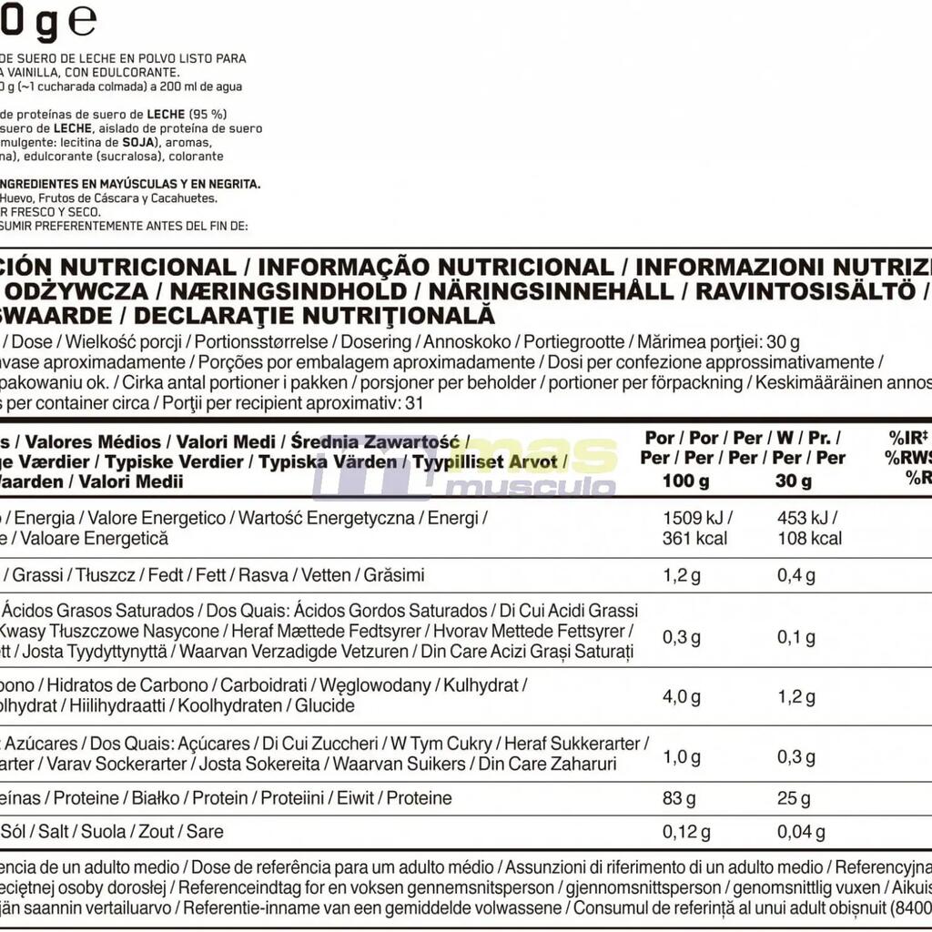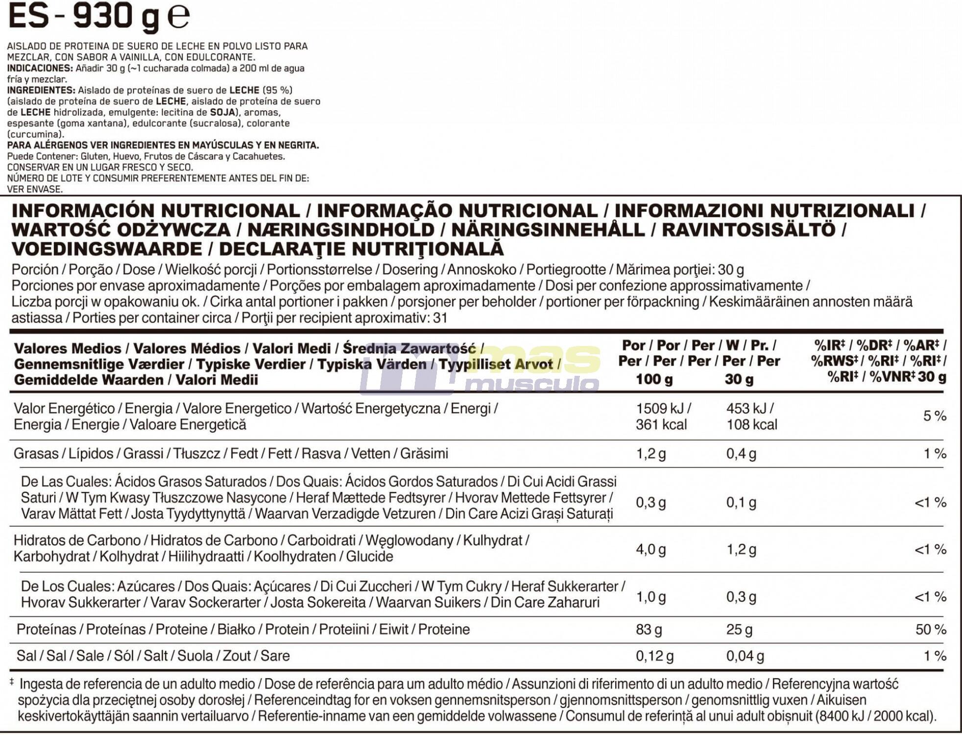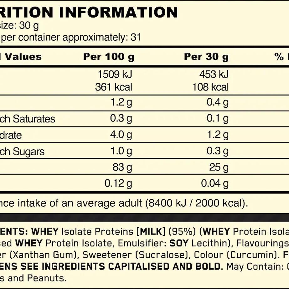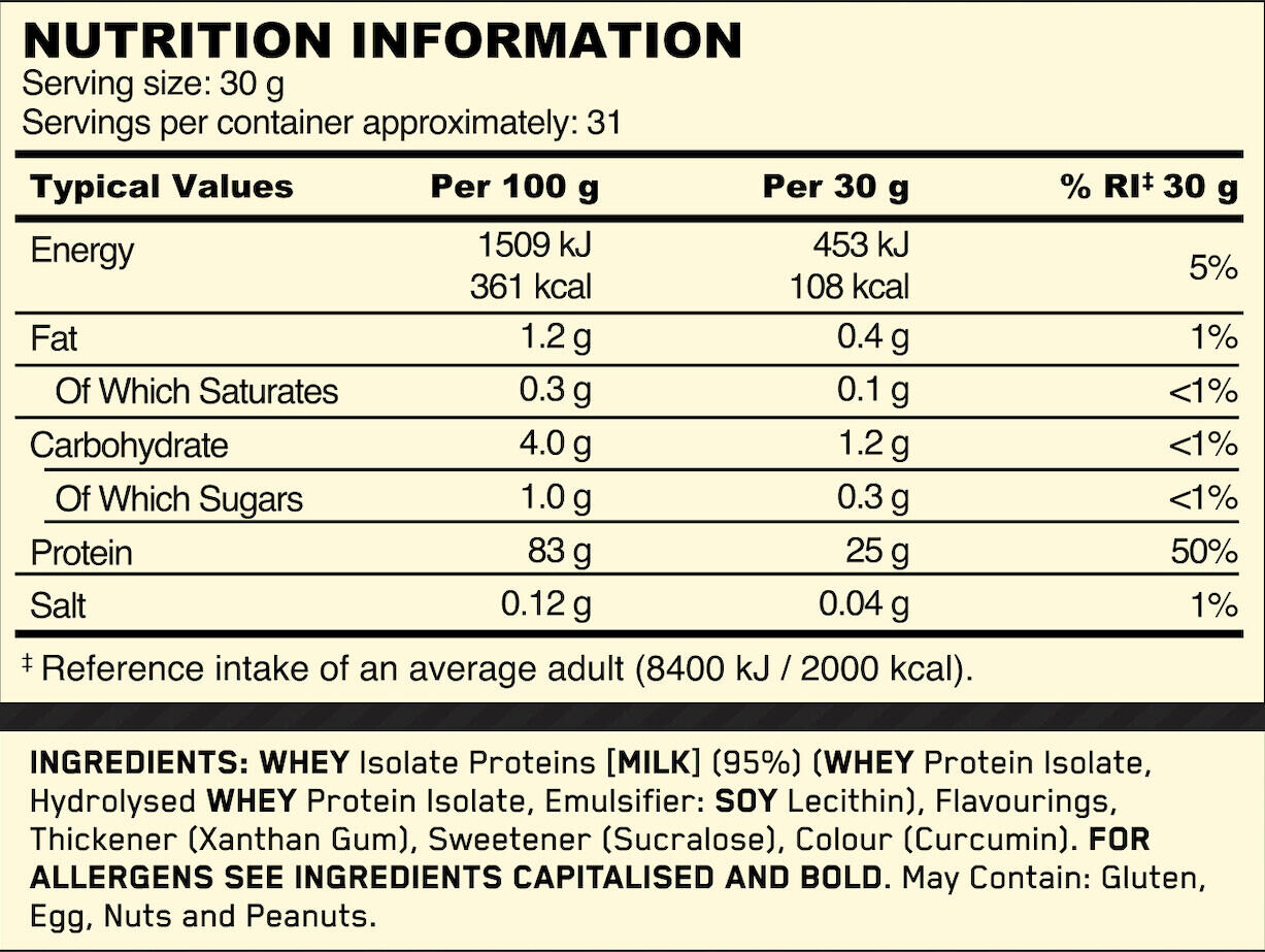 WHEY Isolate Proteins [MILK] (95%) (WHEY Protein Isolate, Hydrolysed WHEY Protein Isolate, Emulsifier: SOY Lecithin), Flavourings, Thickener (Xanthan Gum), Sweetener (Sucralose), Colour (Curcumin).