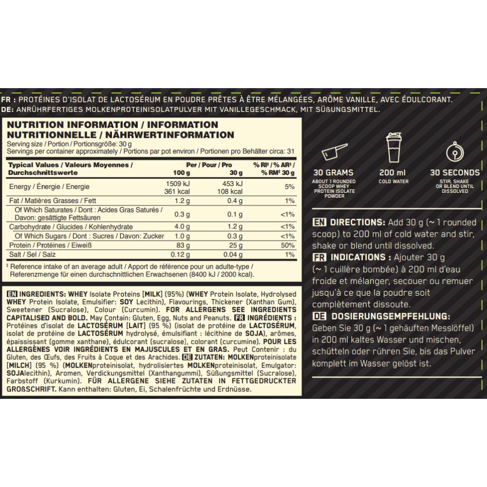 Optimum Nutrition starts by selecting the highest-quality whey proteins, which are then subjected to a series of sophisticated filtration processes that help separate out excess fat and sugar. Part of the whey protein isolate is then hydrolyzed, meaning it is broken down into smaller amino acid chains. The final product is a complete protein containing no more than 0.3 g of sugar, 0.4 g of fat and 83% pure protein per serving. Optimum Nutrition works hard to ensure superior quality so that you can focus on your performance goals. **Instructions for use:** Add 30 g (~1 rounded scoop) to 200 ml of cold water and stir, shake or blend until dissolved.