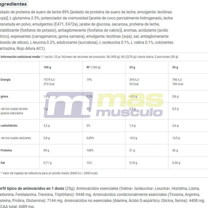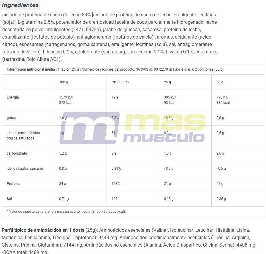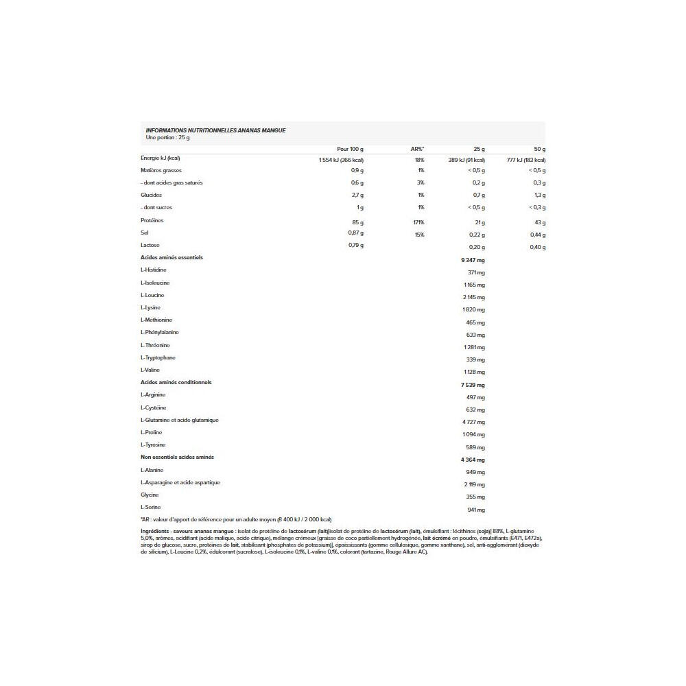 Ingredients - vanilla flavorsProtein isolatewhey(milk)[protein isolate fromwhey (milk), emulsifier: lecithins (soy)] 88%, L-glutamine 5.5%, creamy blend [partially hydrogenated coconut fat,skim milkPowder, emulsifiers (E471, E472a), glucose syrup, sugar, wheat proteinmilk, stabilizer (potassium phosphates), flavourings, thickeners (cellulose gum, xanthan gum), salt, anti-caking agent (silicon dioxide), L-Leucine 0.2%, sweetener (sucralose), L-Isoleucine 0.1%, L-Valine 0.1%, color (tartazine*).*Tartrazine may have an adverse effect on activity and attention in children.Ingredients - Chocolate flavorsProtein isolatewhey(milk)[protein isolate fromwhey (milk), emulsifier: lecithins (soy)] 85%, L-glutamine 5.5%, low-fat cocoa powder 5%, creamy blend [partially hydrogenated coconut fat,skim milkPowder, emulsifiers (E471, E472a), glucose syrup, sugar, wheat proteinmilk, stabilizer (potassium phosphates), thickeners (carrageenan, xanthan gum), flavourings, salt, anti-caking agent (silicon dioxide), L-Leucine 0.2%, sweetener (sucralose), L-Isoleucine 0.1%, L-Valine 0.1%.Ingredients - Strawberry flavorProtein isolatewhey(milk)[protein isolate fromwhey (milk), emulsifier: lecithins (soy)] 87%, L-glutamine 5.5%, flavours, creamy blend [partially hydrogenated coconut fat,skim milkPowder, emulsifiers (E471, E472a), glucose syrup, sugar, wheat proteinmilk, stabilizer (potassium phosphates), thickeners (cellulose gum, xanthan gum), salt, acidifier (malic acid), L-Leucine 0.2%, sweetener (sucralose), L-Isoleucine 0.1%, L-Valine 0.1%, colorant (AC Allure Red).Ingredients Banana :Protein isolate protein isolatewhey90% [protein isolatewhey, emulsifier: lecithins (soy)], L-glutamine 2.5%, creamer [partially hydrogenated coconut fat,milk SkimmedPowder, emulsifiers (E471, E472a), glucose syrup, saccharose, protein ofmilk, stabilizer (potassium phosphates), anti-caking agent (calcium phosphates)], flavourings, thickeners (carrageenan, xanthan gum), emulsifier: lecithins (soy), salt, anti-caking agent (silicon dioxide), acid (citric acid), L-Leucine 0.2%, sweetener (sucralose), L-isoleucine 0.1%, L-valine 0.1%, colorant (tartrazine*).Ingredients Pineapple - MangoProtein isolatewhey89% [protein isolatewhey, emulsifier: lecithins (soy)], L-glutamine 2.5%, creamer [partially hydrogenated coconut fat,milk SkimmedPowder, emulsifiers (E471, E472a), glucose syrup, sucrose, milk proteinmilk, stabilizer (potassium phosphates), anti-caking agent (calcium phosphates)], flavourings, acid (citric acid), thickeners (carrageenan, xanthan gum), emulsifier: lecithins (soy), salt, anti-caking agent (silicon dioxide), L-Leucine 0.2%, sweetener (sucralose), L-Isoleucine 0.1%, L-Valine 0.1%, colorants (tartrazine, Allura Red AC1).Ingredients - Cookie flavorsProtein isolatewhey(milk)[protein isolate fromwhey (milk), emulsifier: lecithins (soy)] 87%, L-glutamine 5.5%, flavours (contains caffeine), creamy blend [partially hydrogenated coconut fat,skim milkPowder, emulsifiers (E471, E472a), glucose syrup, sugar, wheat proteinmilk, stabilizer (potassium phosphates), thickeners (cellulose gum, xanthan gum), chocolate chips [pâte de cacao, beurre de cacao, cacao maigre en poudre, émulsifiant [lécithines (soja)], flavor], salt, cinnamon powder, anti-caking agent (silicon dioxide), L-Leucine 0.2%, sweetener (sucralose), L-isoleucine 0.1%, L-valine 0.1%.Ingredients Black Biscuit :protein isolatewhey[protein isolatewhey (milk), emulsifier: lecithins (soy)] 86%, L-glutamine, cookie pieces 3% [farine de riz, sucre, amidon de maïs, huile de coco raffinée, cacao maigre en poudre, sirop de glucose, sel, épaississant (gomme de guar), poudre à lever (bicarbonate d?ammonium, bicarbonate de sodium), arôme], creamy blend [partially hydrogenated coconut fat,skim milkPowder, emulsifiers (E471, E472a), glucose syrup, sugar, wheat proteinmilk, stabilizer (potassium phosphates), flavourings, thickeners (cellulose gum, xanthan gum), salt, anti-caking agent (silicon dioxide), L-leucine 0.2%, sweeten