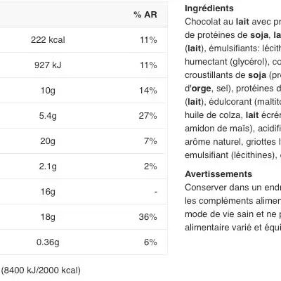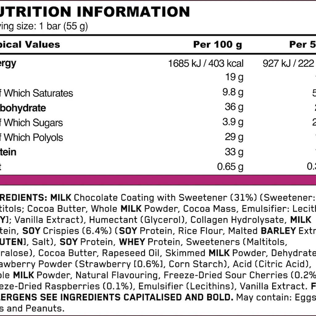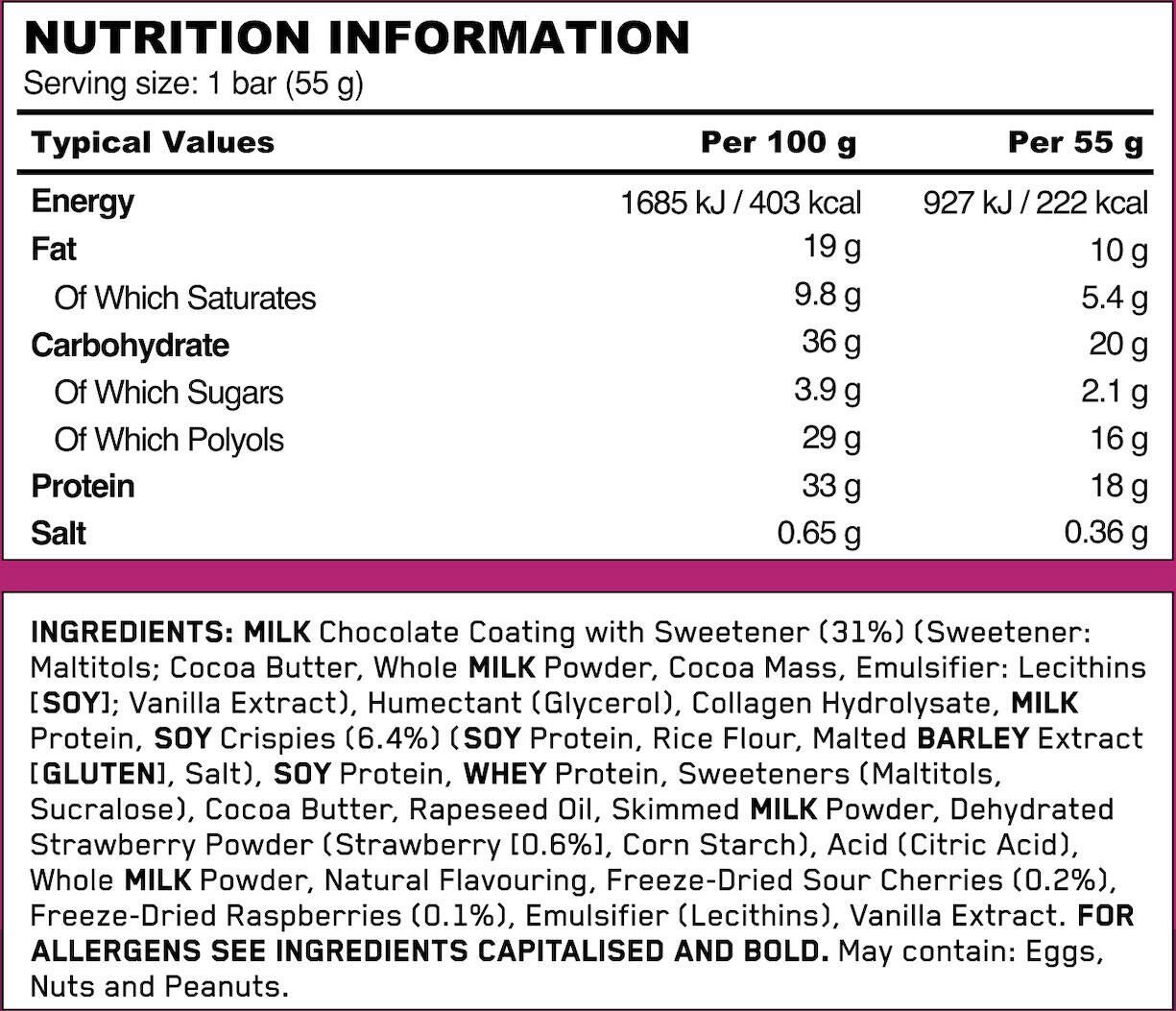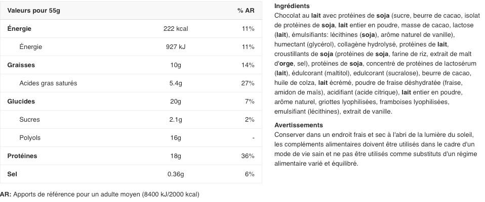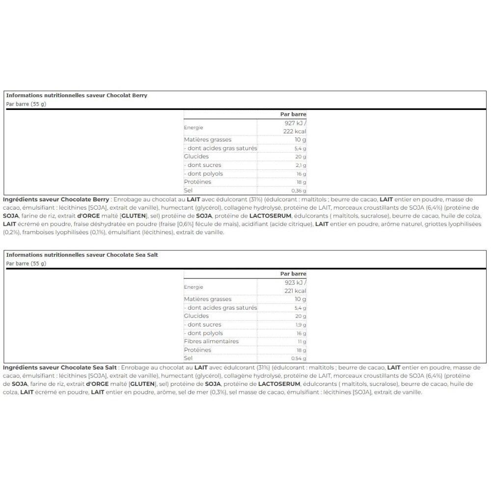 Chocolate Berry flavour ingredients: MILK chocolate coating with sweetener (31%) (sweetener: maltitols, cocoa butter, whole milk powder, cocoa mass, emulsifier : lecithins [SOJA], vanilla extract), humectant (glycerol), hydrolyzed collagen, MILK protein, SOYA crisp pieces (6.4%) ( SOYA protein, rice flour, malted barley extract[GLUTEN], salt) SOYA protein, LACTOSERUM protein, sweeteners ( maltitols, sucralose), cocoa butter, rapeseed oil, skimmed MILK powder, dehydrated strawberry powder (strawberry [0,6%] cornstarch), acidifier (citric acid), whole MILK powder, natural flavor, freeze-dried Morello cherries (0.2%), freeze-dried raspberries (0.1%), emulsifier (lecithins), vanilla extract.Chocolate Sea Salt flavor ingredients: MILK chocolate coating with sweetener (31%) (sweetener: maltitols, cocoa butter, whole milk powder, cocoa mass, emulsifier : lecithins [SOJA], vanilla extract), humectant (glycerol), hydrolyzed collagen, MILK protein, crispy SOJA pieces (6.4%) ( SOJA protein, rice flour, malted BARLEY extract[GLUTEN], salt) SOJA protein, lACTOSERUM protein, sweeteners ( maltitols, sucralose), cocoa butter, rapeseed oil, skimmed MILK powder, whole MILK powder, flavoring, sea salt (0.3%), salt cocoa mass, emulsifier : lecithins [SOJA], vanilla extract.