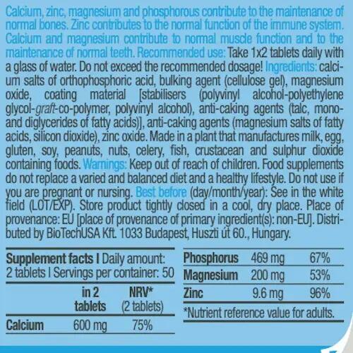 BioTech USA's Calcium Zinc Magnesium is a mineral supplement that enhances strength, muscle growth, and coordination, while also strengthening the immune system and supporting healthy bones, skin, and hair. This product delivers comprehensive supplementation performance thanks to a synergistic blend of minerals and antioxidant ingredients. It aids in weight loss, regulates heart rate and brain function, supports collagen formation, and supports digestion, in addition to being beneficial for teeth and nails.