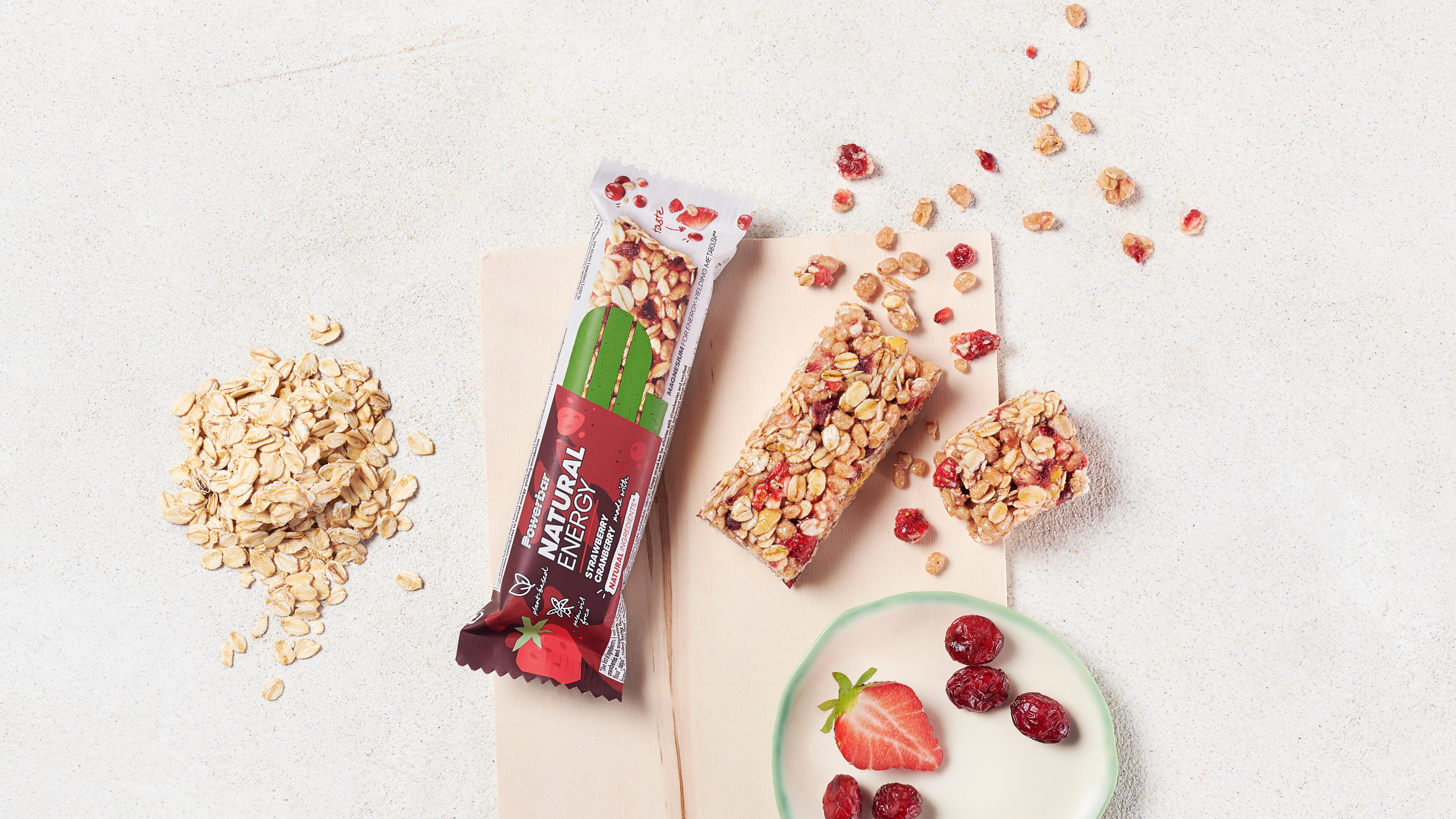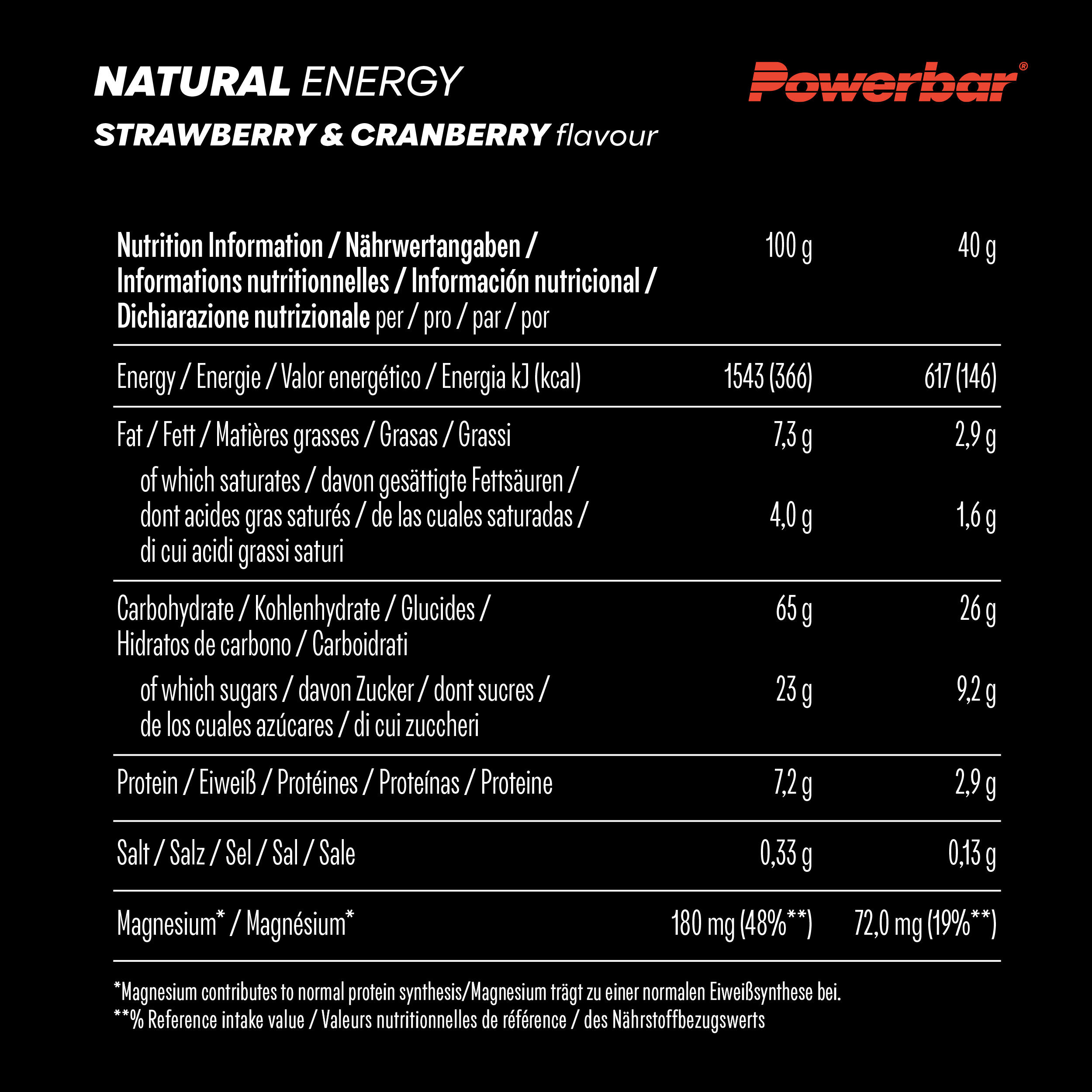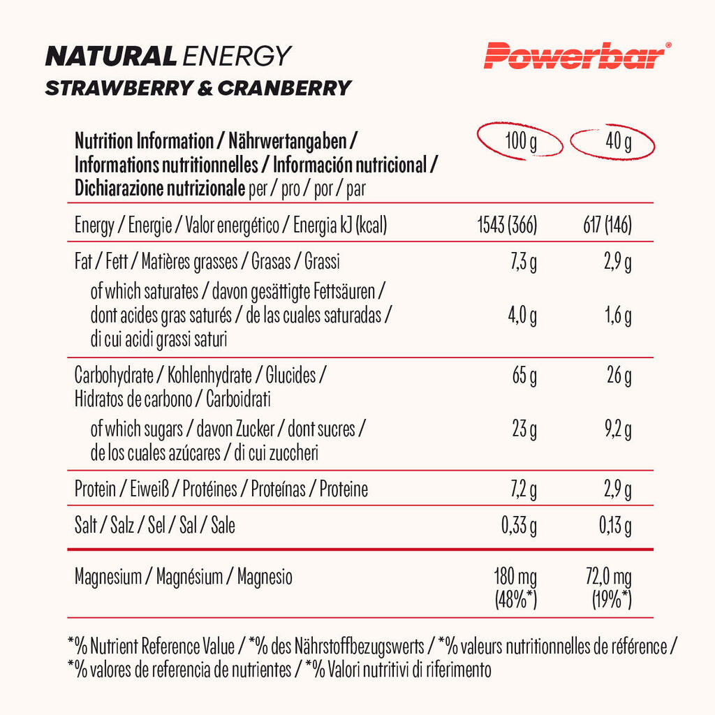 Ingredients Chocolate crunch: Wholemeal oats* (29%), invert sugar syrup, maltodextrin*, wholemeal crispies (12%) [wholemeal wheat flour*, rice flour*, sugar*, malted barley flour*, malted wheat flour*, salt, rapeseed oil*, acidity regulator (calcium carbonate), emulsifier ( soya lecithin)], cocoa mass* (5%), soya beans*, dark chocolate (4%) [cocoa mass*, sugar*, emulsifier ( soya lecithin), natural vanilla flavour*], coconut oil*, magnesium citrate, humectant (glycerol), salt, emulsifier ( soya lecithin), vanilla extract*.*of natural origin. Ingredients Raspberry: Chickpeas* (21%) (chickpeas*, candied large-fruited cranberries* (21%) (sugar*, large-fruited cranberries*, rice flour*, sunflower oil*), invert sugar syrup, roasted peanuts*, cereal crispies (9%) ( wheat flour*, malted wheat*, salt), maltodextrin*, glucose syrup, soya beans*, coconut oil*, freeze-dried raspberries* (2%), concentrated apple juice*, magnesium citrate, concentrated lemon juice*, natural flavour*, humectant (glycerol), salt, emulsifier ( soya lecithin), vanilla extract*. * of natural origin.